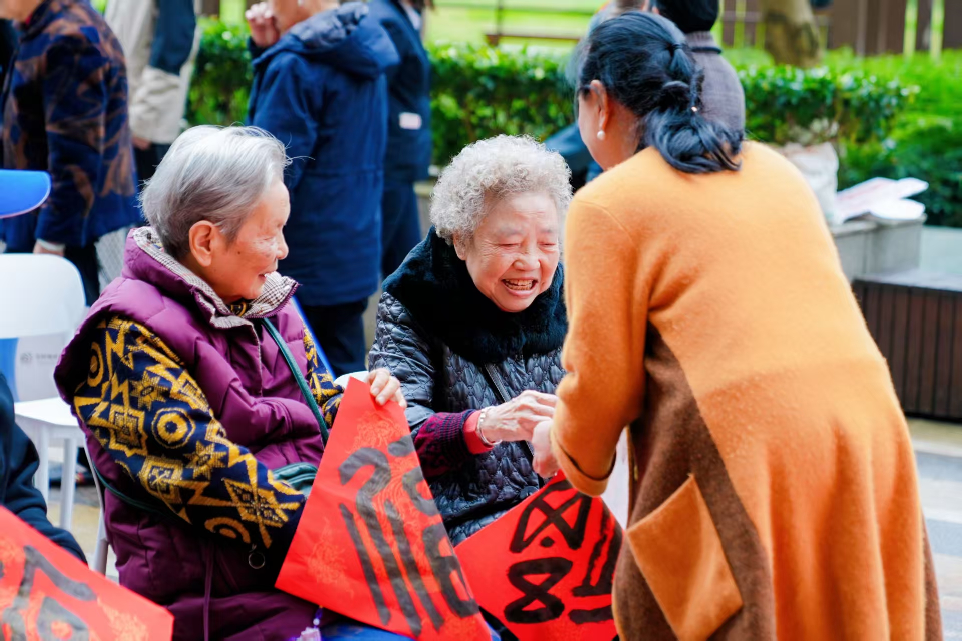此外,现场还有书法老师挥毫泼墨,为老人们书写寓意吉祥的“福”“寿” 字帖,送上节日祝福。企业代表也为长者们准备了饼干和保暖毛线帽,并贴心叮嘱:“天凉了,戴上帽子暖和点!”