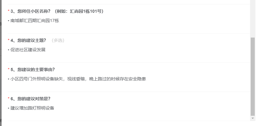 10月中旬,府城社区微信公众号“人民建议征集”板块收到一条来自南城都汇汇尚园居民王女士的留言:“小区四号门外照明设备缺失,视线昏暗,存在安全隐患,建议增加路灯。”这条看似普通的建议,迅速启动了社区治理的响应机制。
