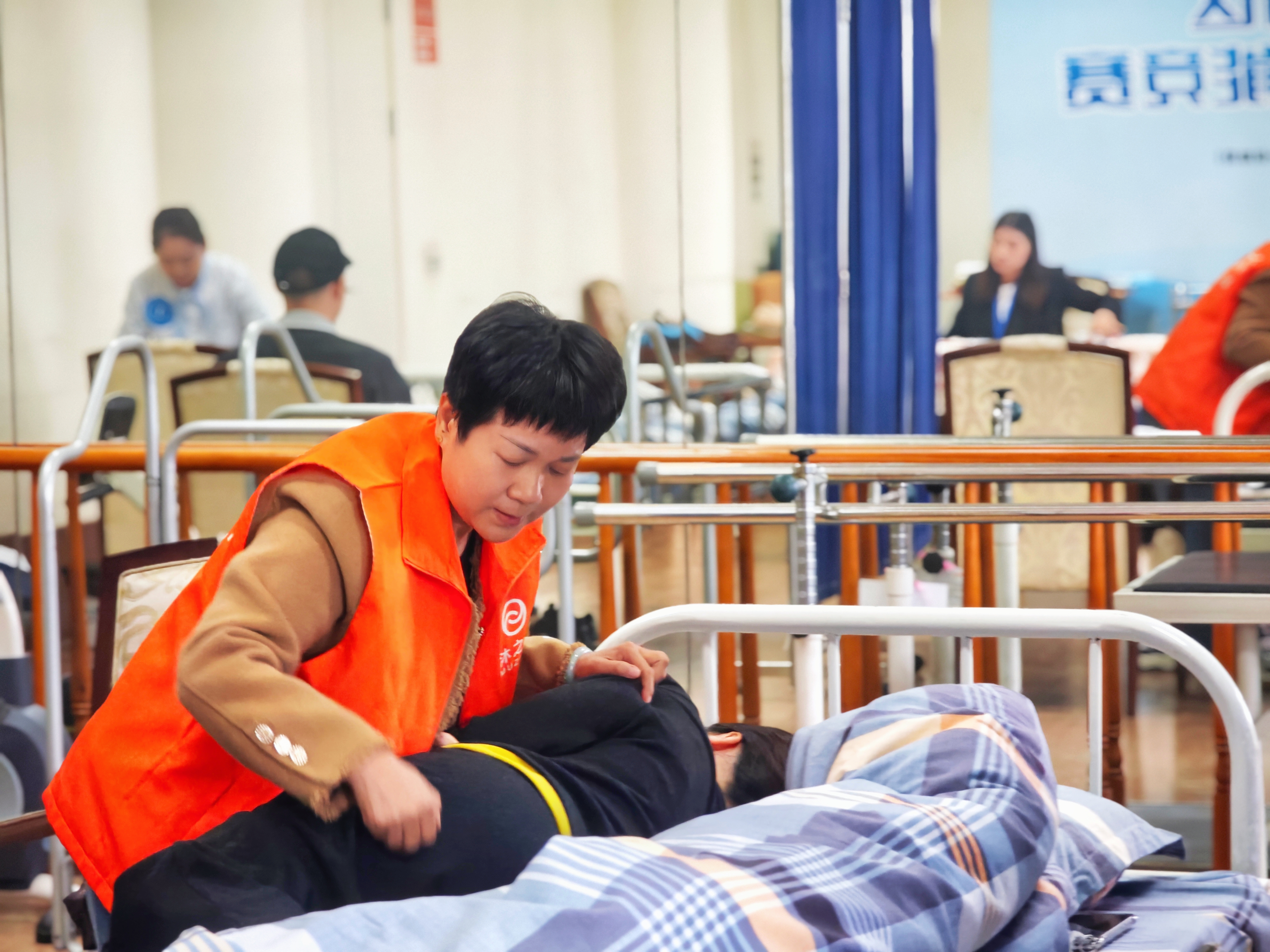 在生活照护区,面对模拟的偏瘫老年人,选手们一边柔声沟通:“奶奶,我们现在要换衣服了,我先帮您侧过身……”一边娴熟地为其更换套头衫,动作轻柔、流程规范,全程注重保护老人患侧肢体。