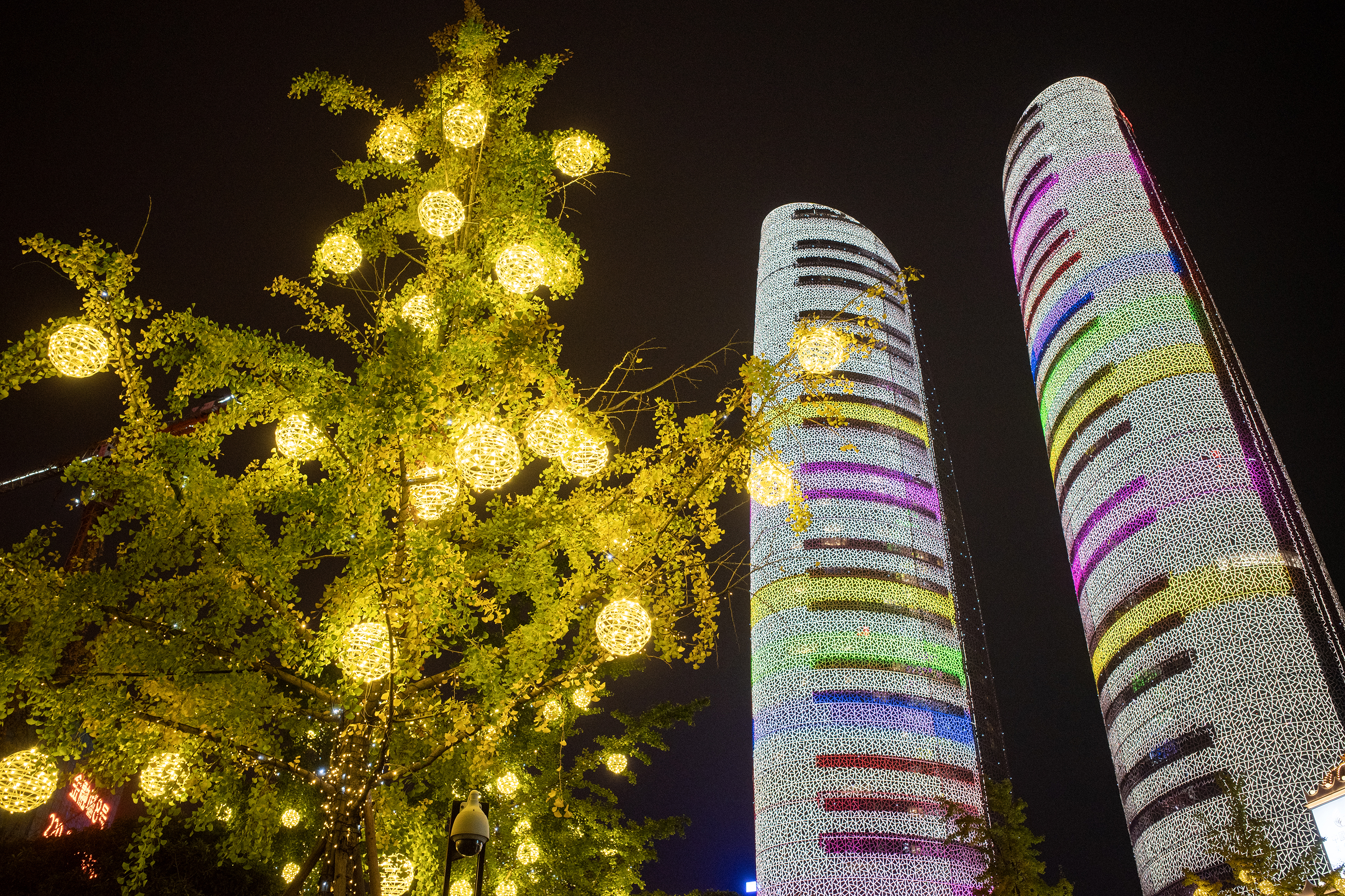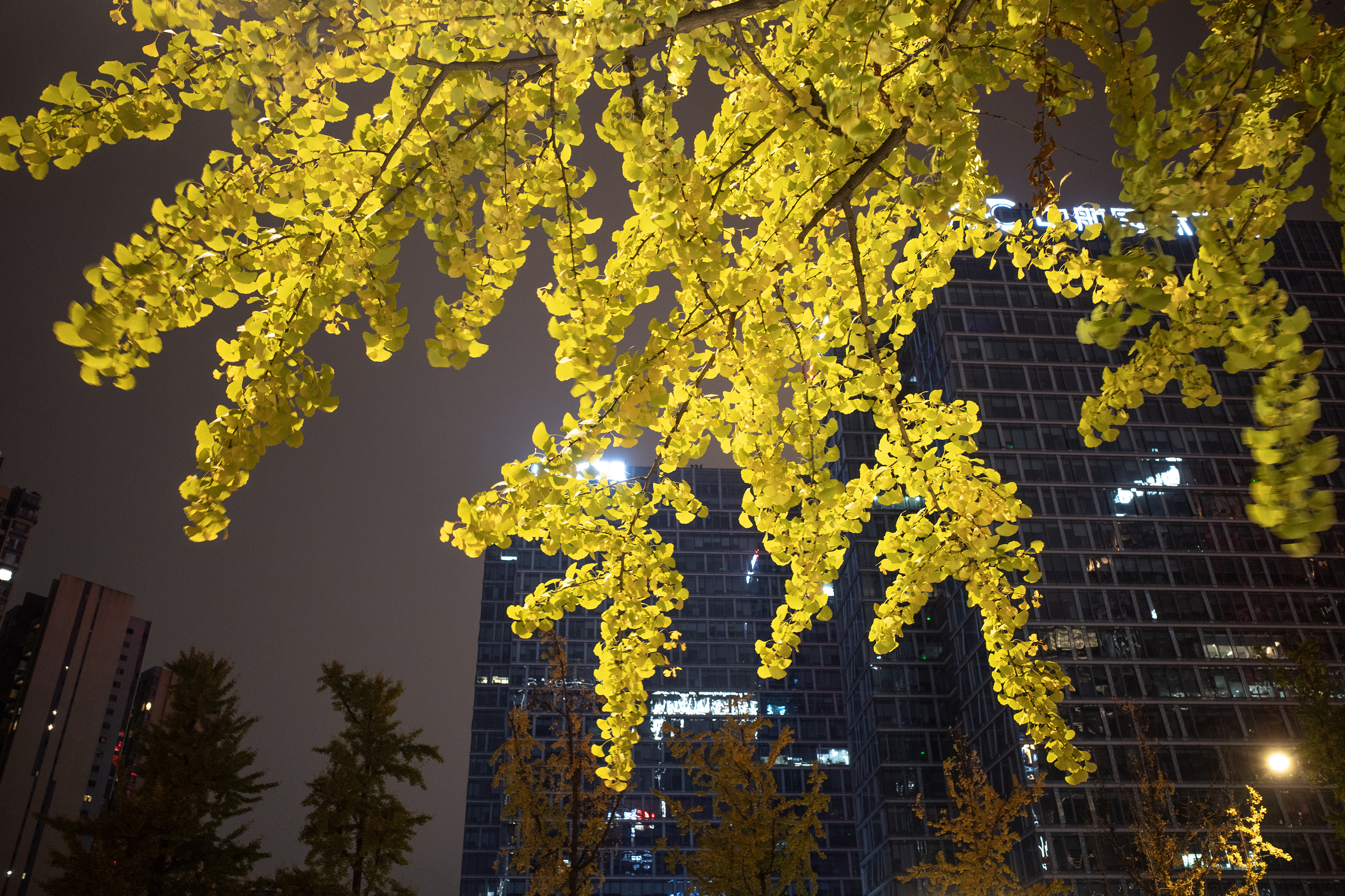 夜幕降临,交子商圈里大片银杏林与周边建筑相得益彰,部分区域更有火红枫叶点缀其间,冷暖色调交织出层次丰富的秋日图景,成为市民打卡的核心点位。