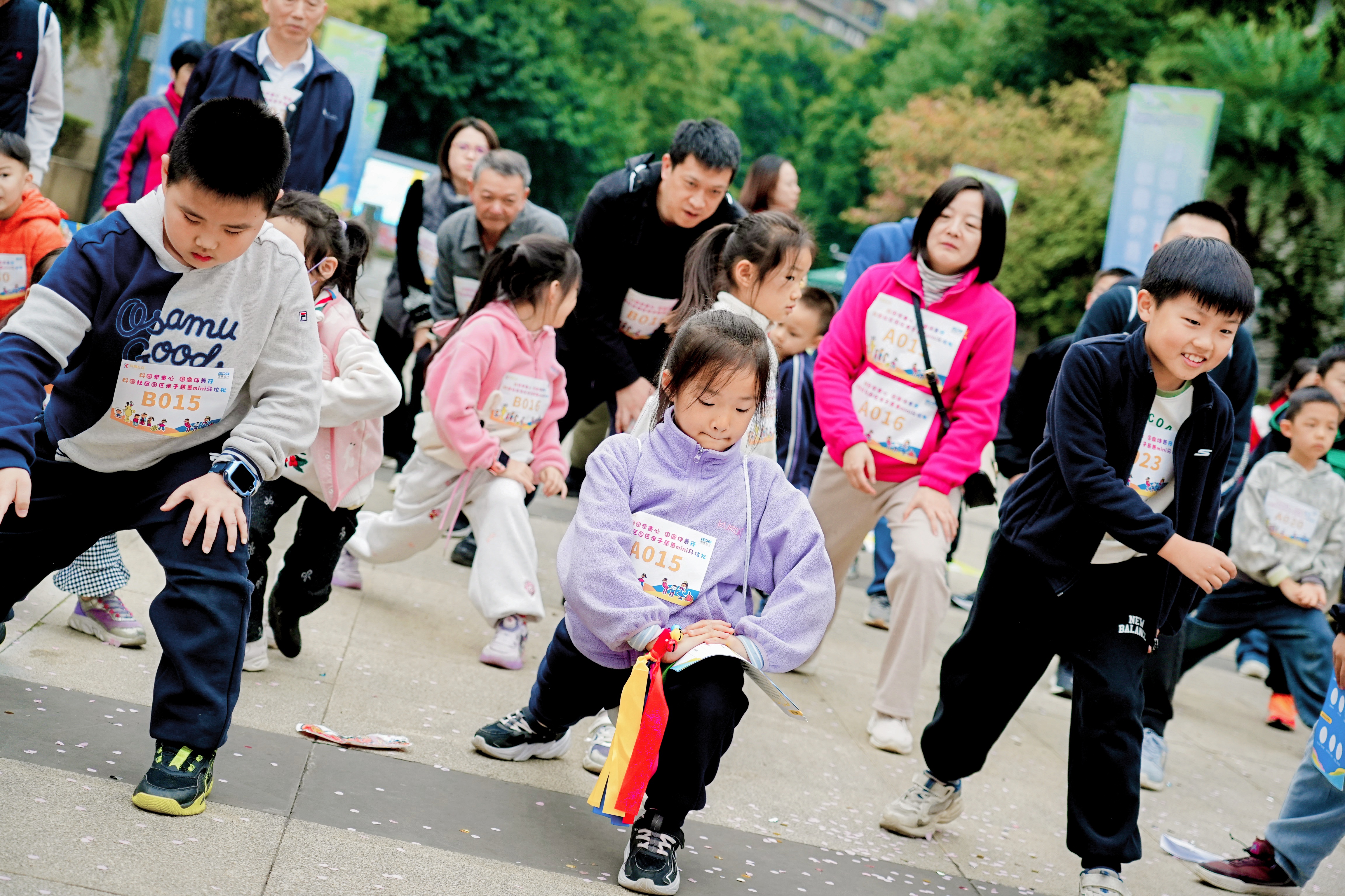 随着专业教练带领热身运动结束,迷你马拉松正式鸣枪开跑。亲子家庭沿园区人行道按规定路线奔跑三圈,途中完成中点打卡,最终以敲响铜锣冲线。