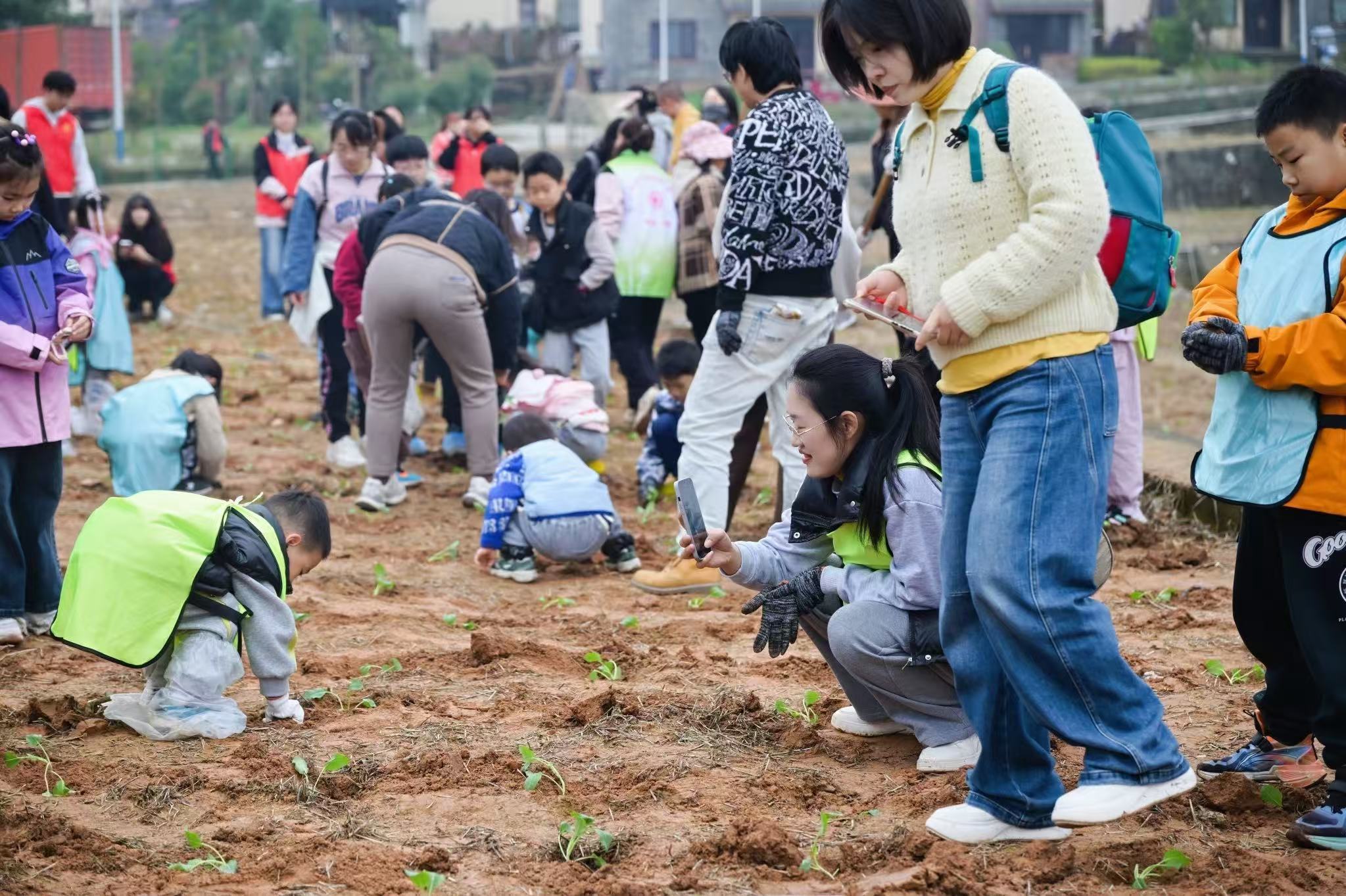 在最受大家期待的油菜苗种植环节,亲子搭档分工协作,有的挥着小锄头翻土,有的小心翼翼栽下菜苗,有的俯身培土压实,有的提着水壶浇水灌溉,孩子们在劳作中掌握种植技巧,体会“粒粒皆辛苦”的传统智慧。