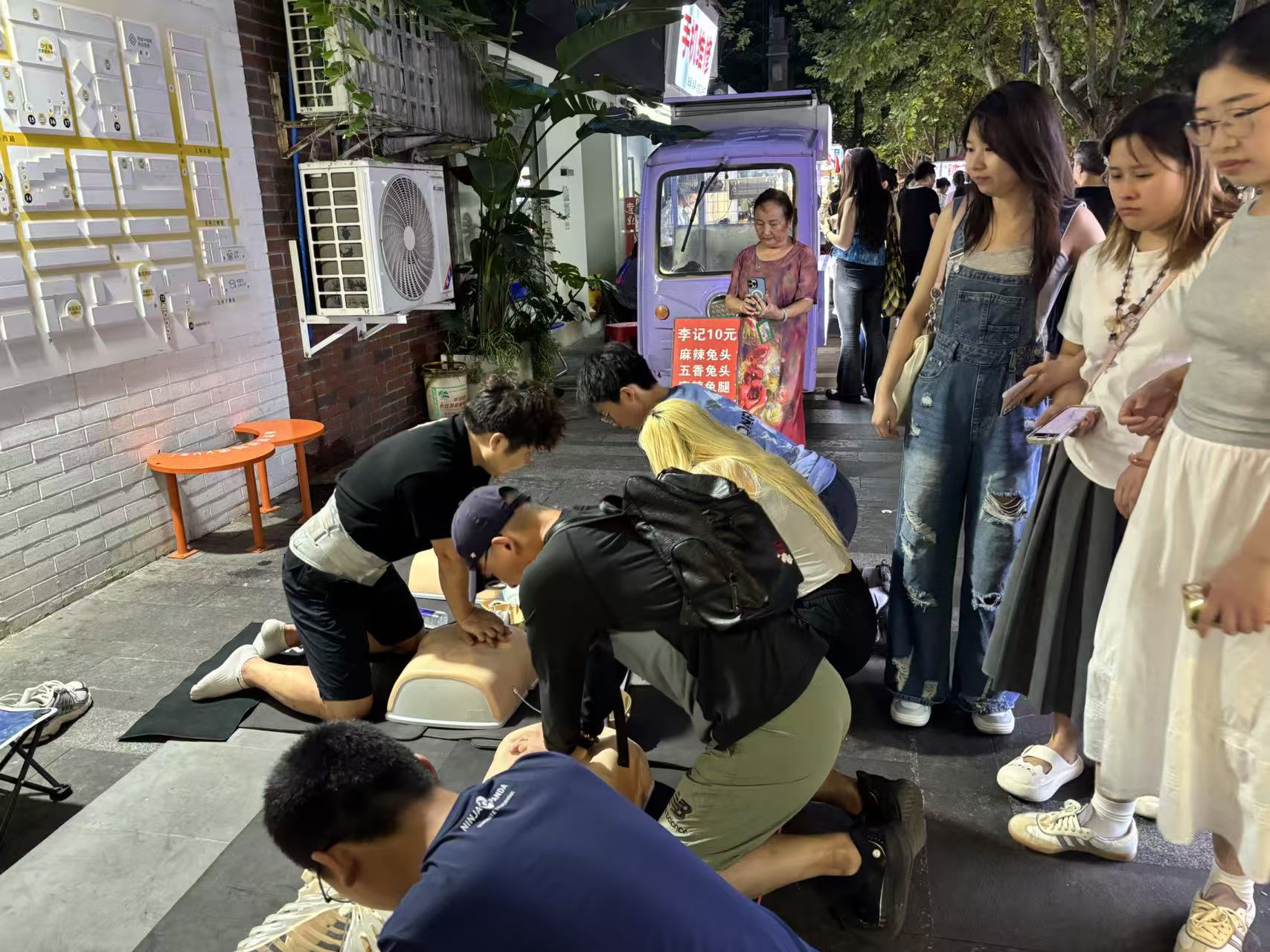 第一次在这里摆摊时,李春亮还曾因无人问津而尴尬。如今,他的“急救小摊”已完成96场教学,超过2000名市民学会了“救命”的技能。全程跪姿示范3个小时,常常让他结束后腰酸背痛,但每当想到那位用他教授的技能在湖南成功救人的网友,他就觉得一切都值得。“我多做一场,就会多几人了解掌握急救知识,也许某天就能因此挽回一条生命。”