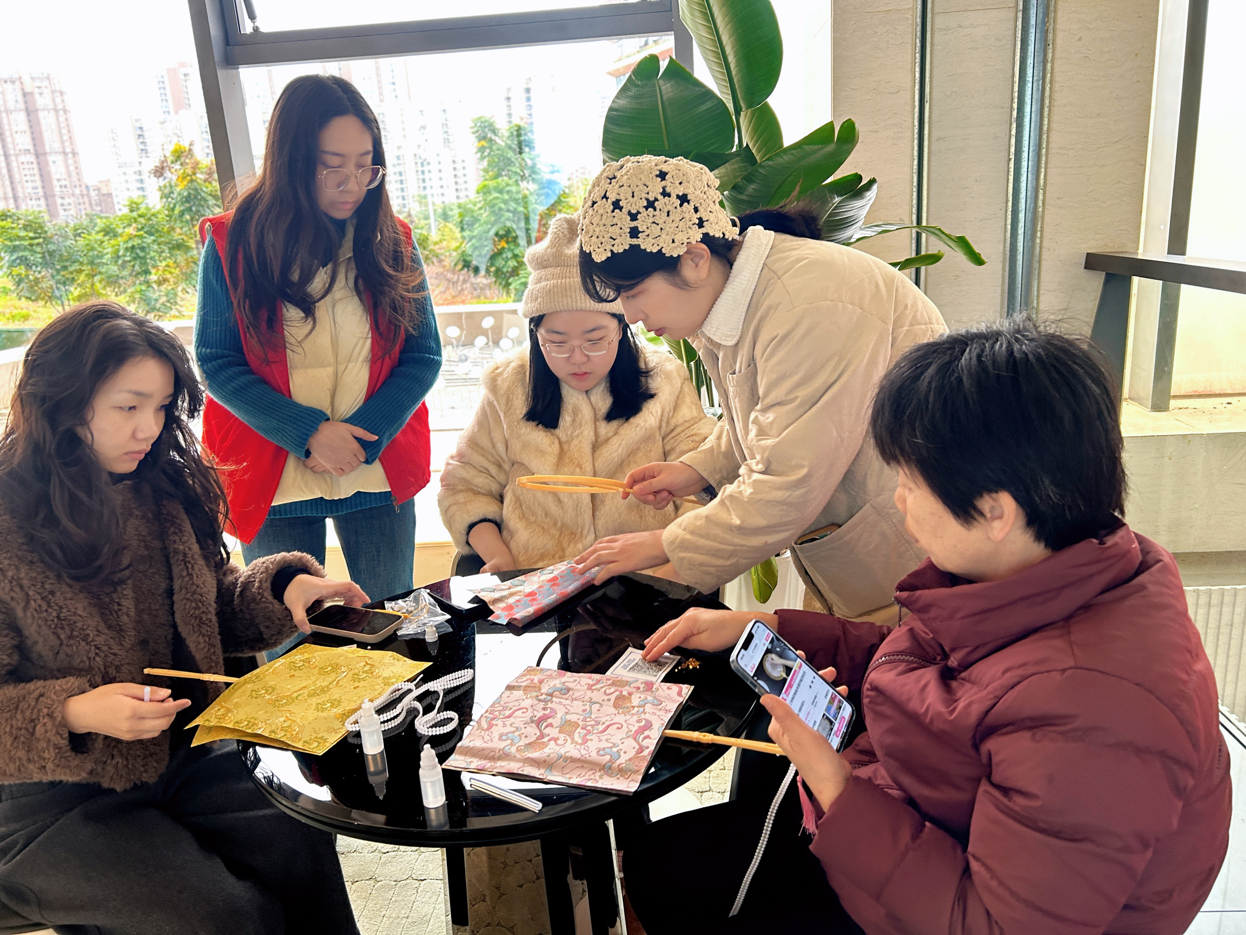 宋锦珍珠扇制作活动,则是将传统美学与创业赋能相结合。非遗老师详解宋锦“锦绣之冠”的文化渊源与团扇寓意,分享传统工艺现代转化思路,再拆解剪轮廓、贴宋锦、缀珍珠等步骤手把手教学。女性居民发挥创意,将华美宋锦与莹润珍珠巧妙搭配,制作出兼具古典韵味与个性风格的团扇,在精工细作中感悟匠人精神,在邻里互动中凝聚创业共识。