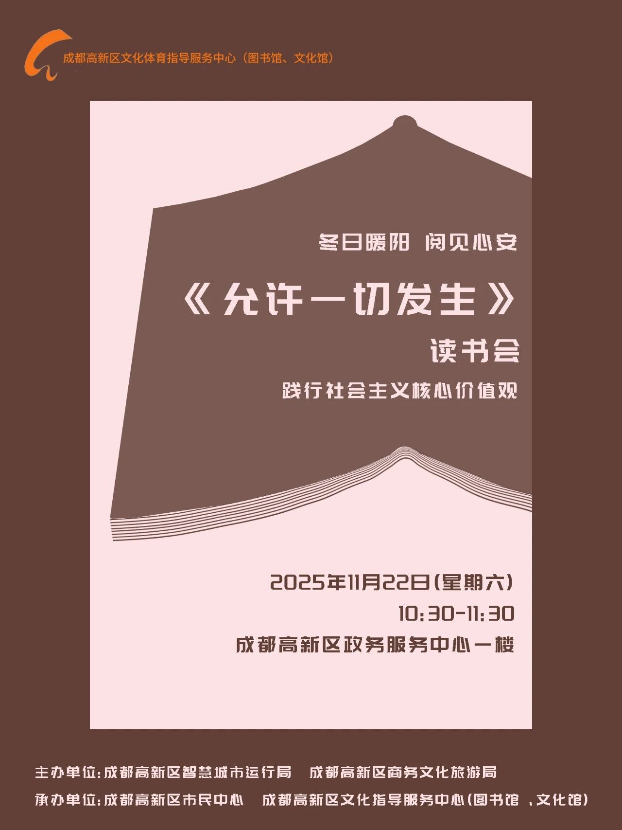 《允许一切发生》被称为“现代人的心灵成长指南”,作者以自己在学业、事业与情感等方面的真实经历为线索,阐述“允许一切发生”的智慧——不是退让或妥协,而是在面对生活的不确定性时,学会接纳情绪、拥抱不完美。读书会将带领读者共同走进书中的观点与故事,探讨如何在快节奏、高压力的生活中,与自我和解。