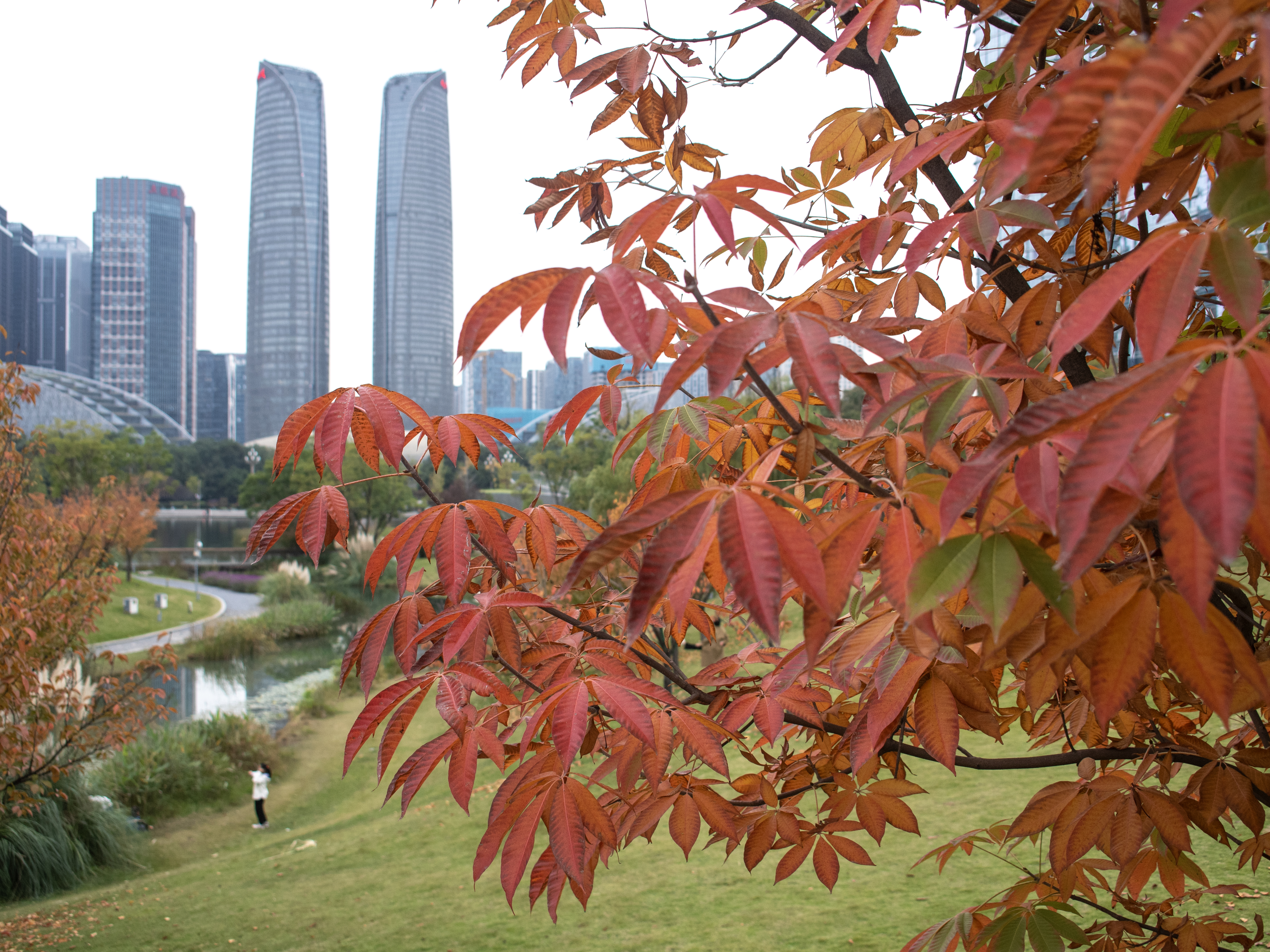 交子公园,鸡爪槭树叶正红,成为公园中一道美丽的风景线。