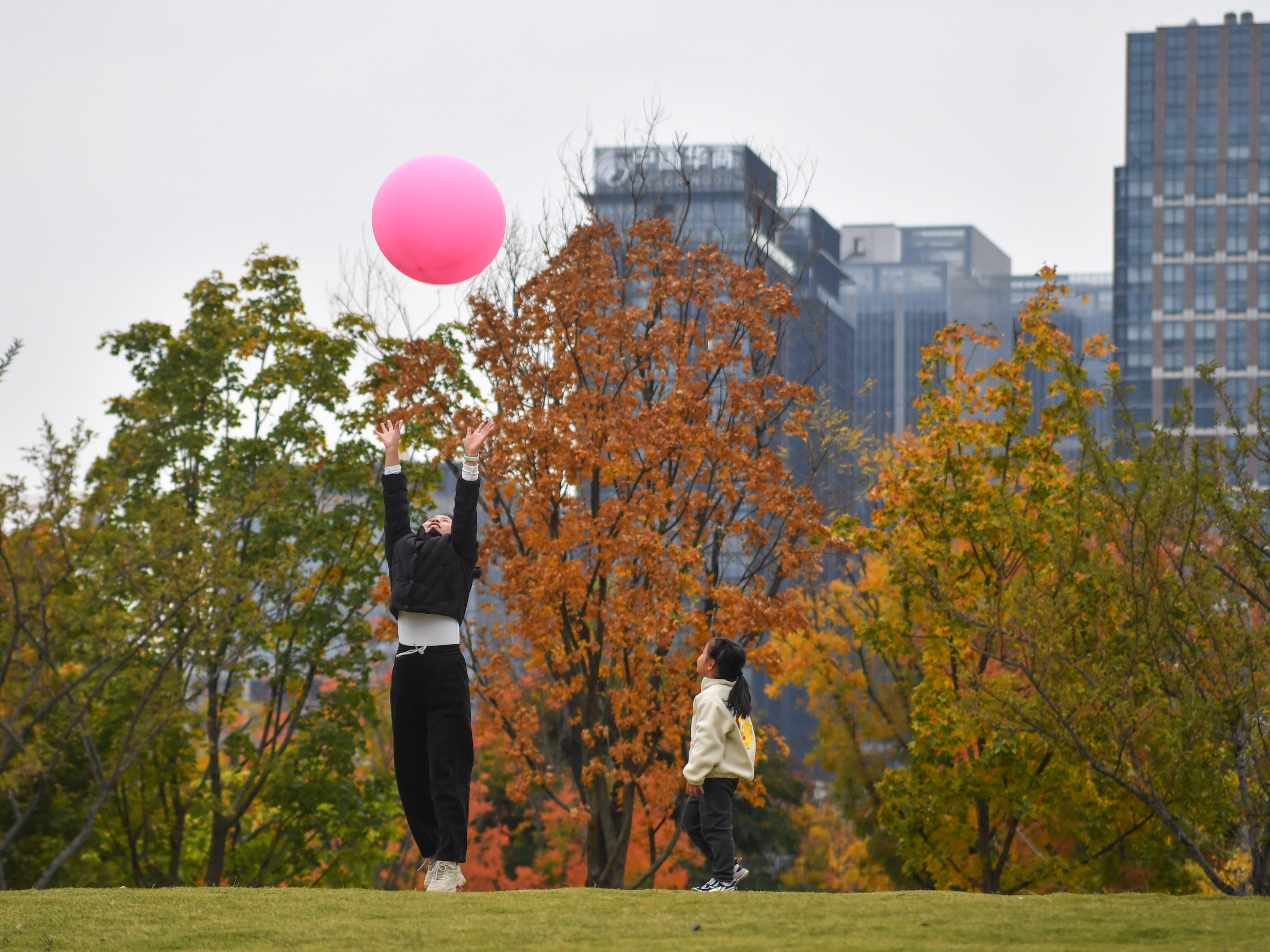 交子公园,一对母女正在草坪上休憩玩耍。
