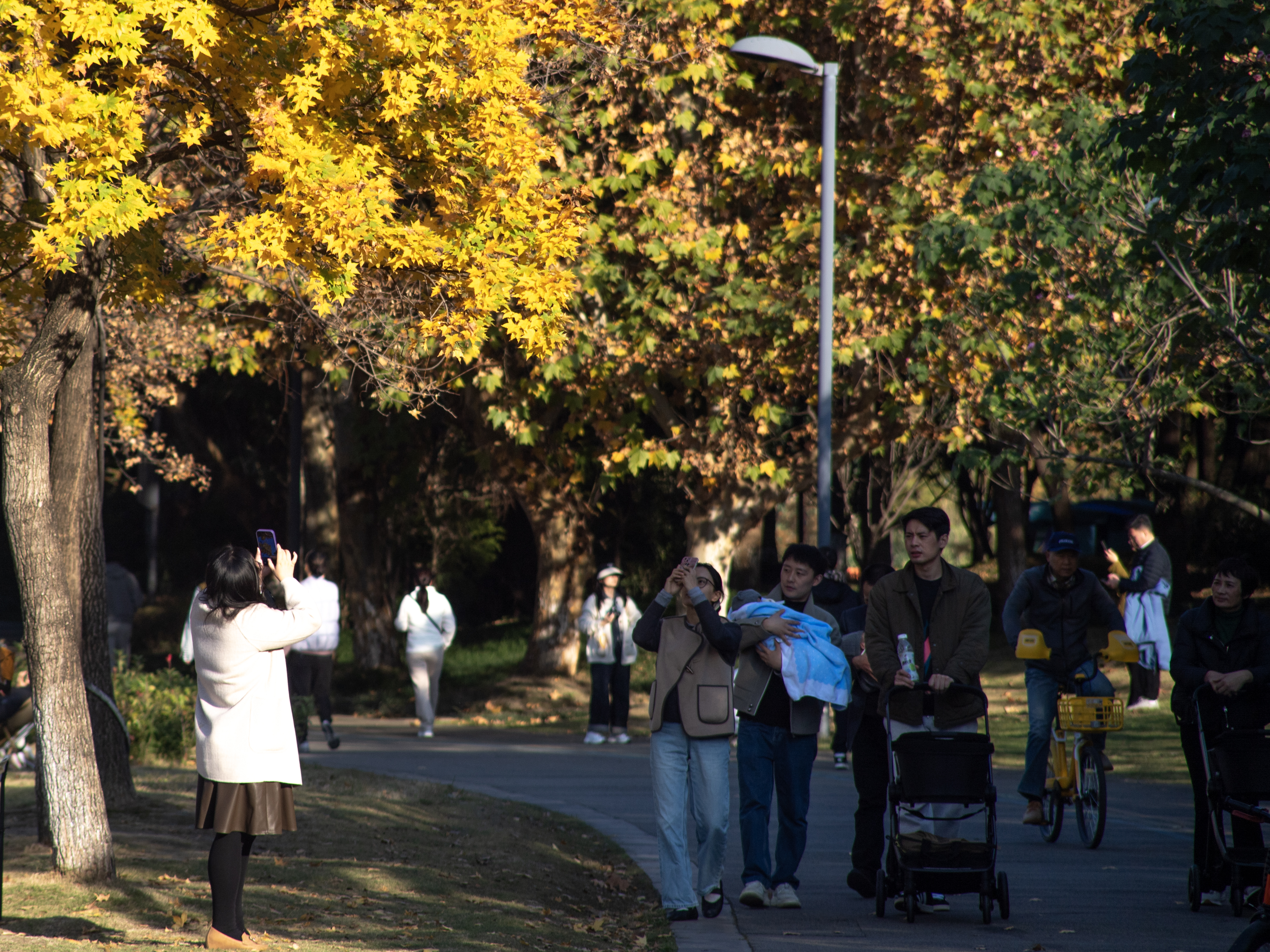 锦城公园,享受阳光的市民们在一棵枫树下驻足拍照。