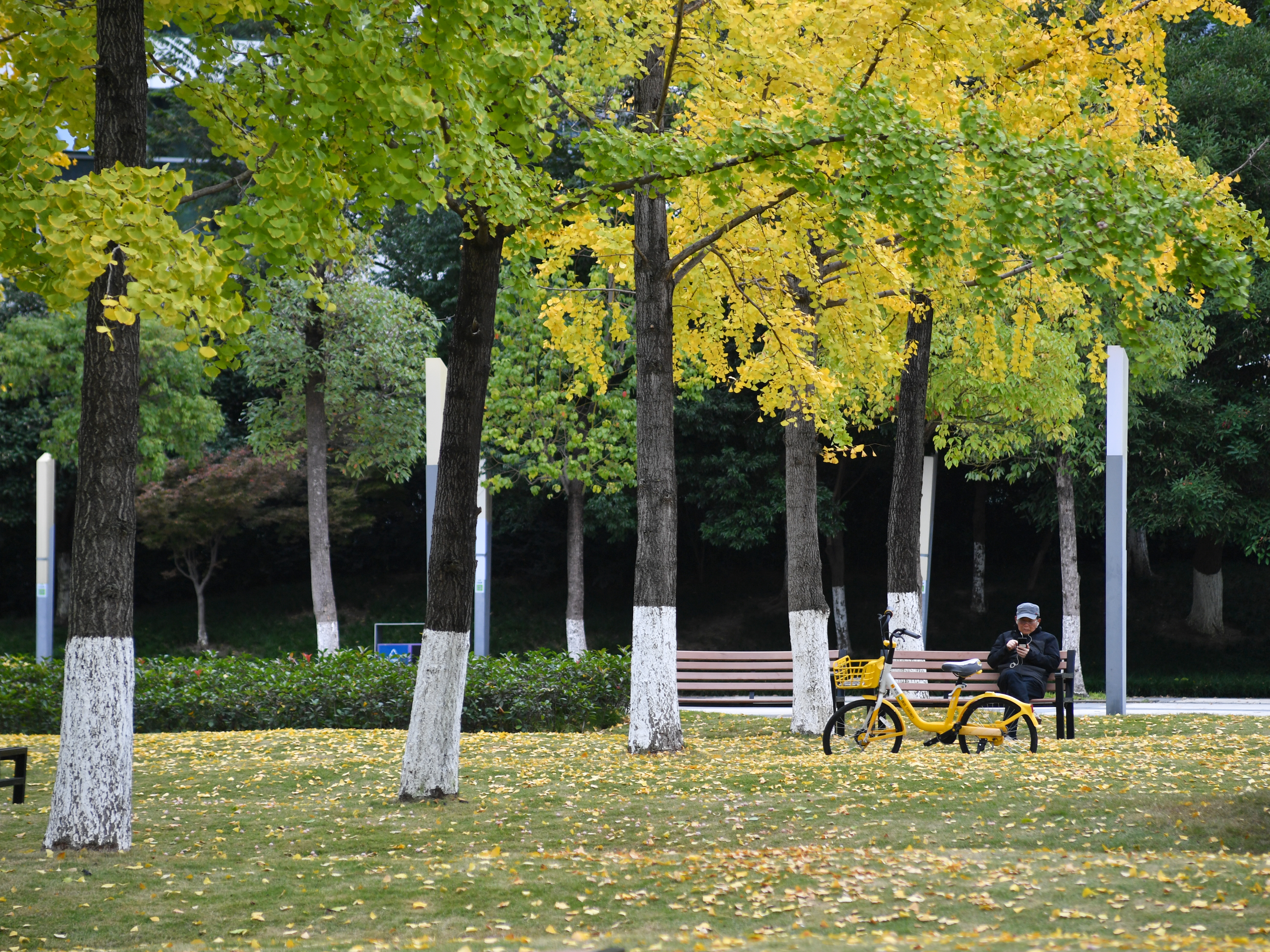 新川之心中央公园,银杏叶渐黄。市民坐在公园长椅上享受休闲时光。