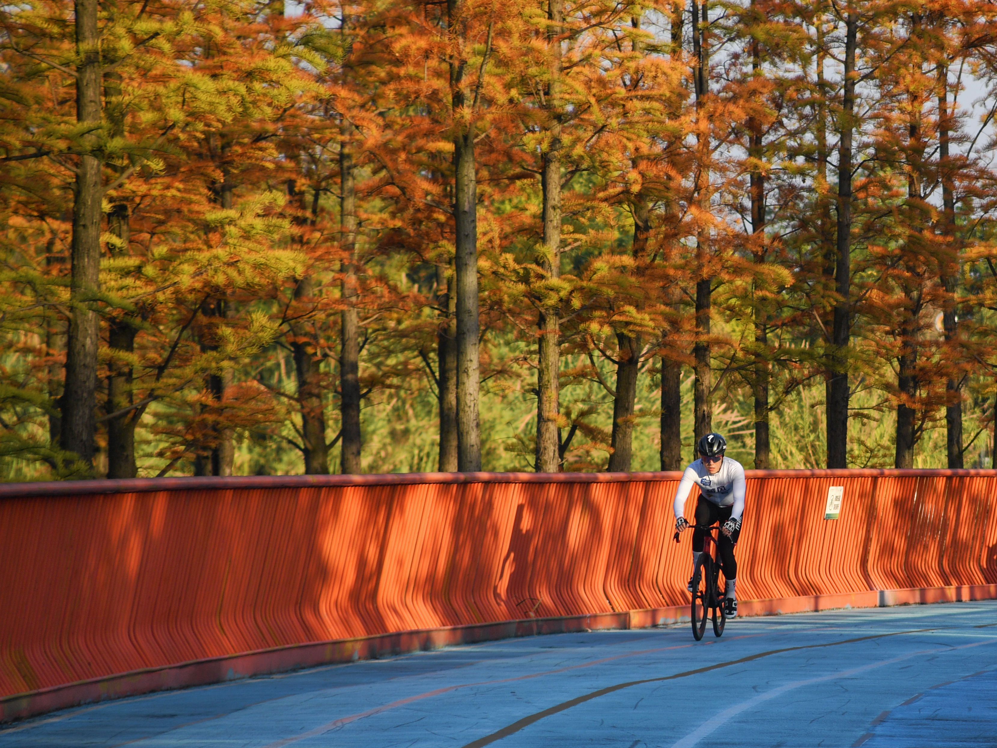 锦城湖公园,迎着阳光,市民正在绿道上骑行。
