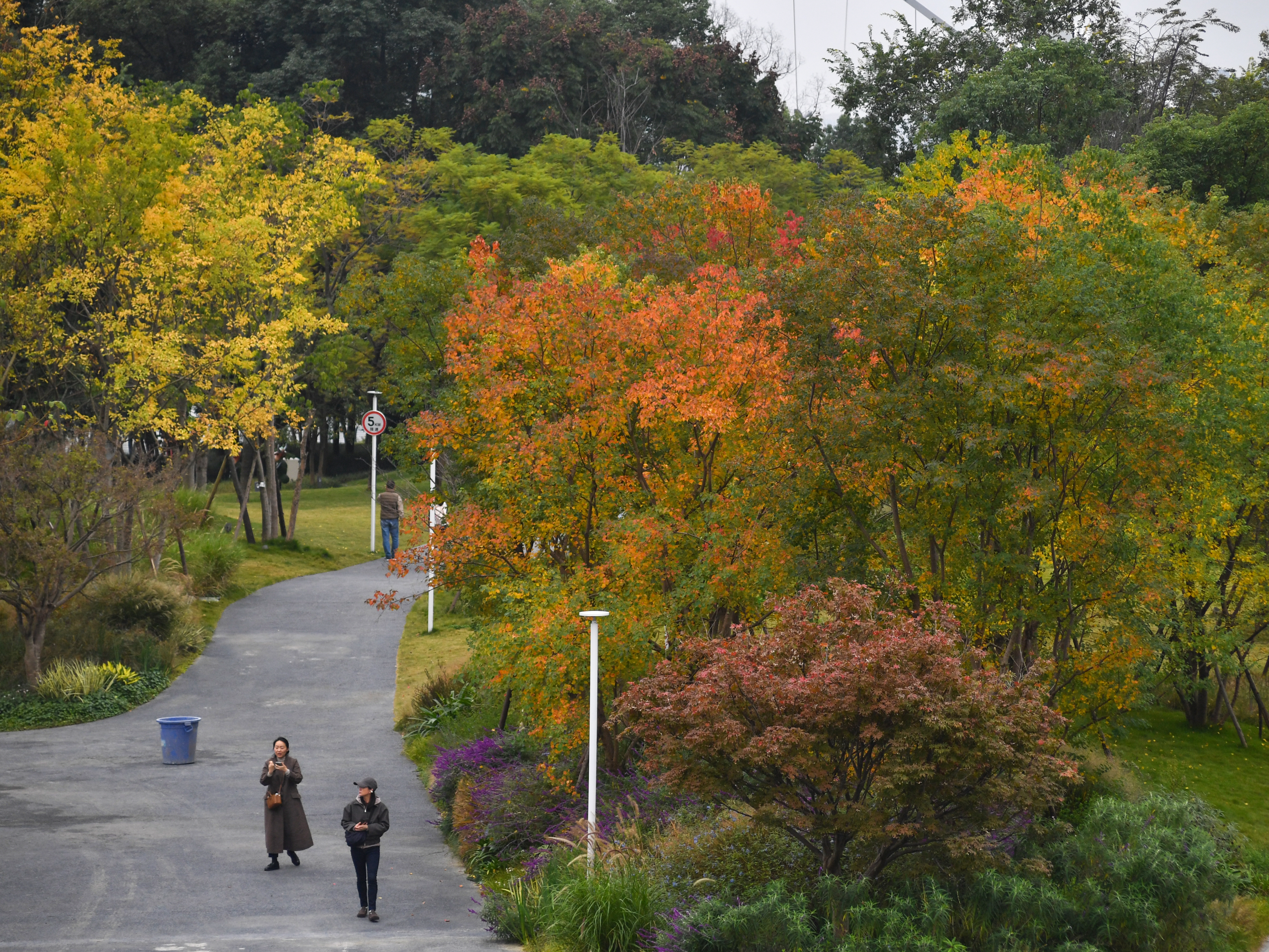 科华南路,行人走在布满植物的五彩小径中。