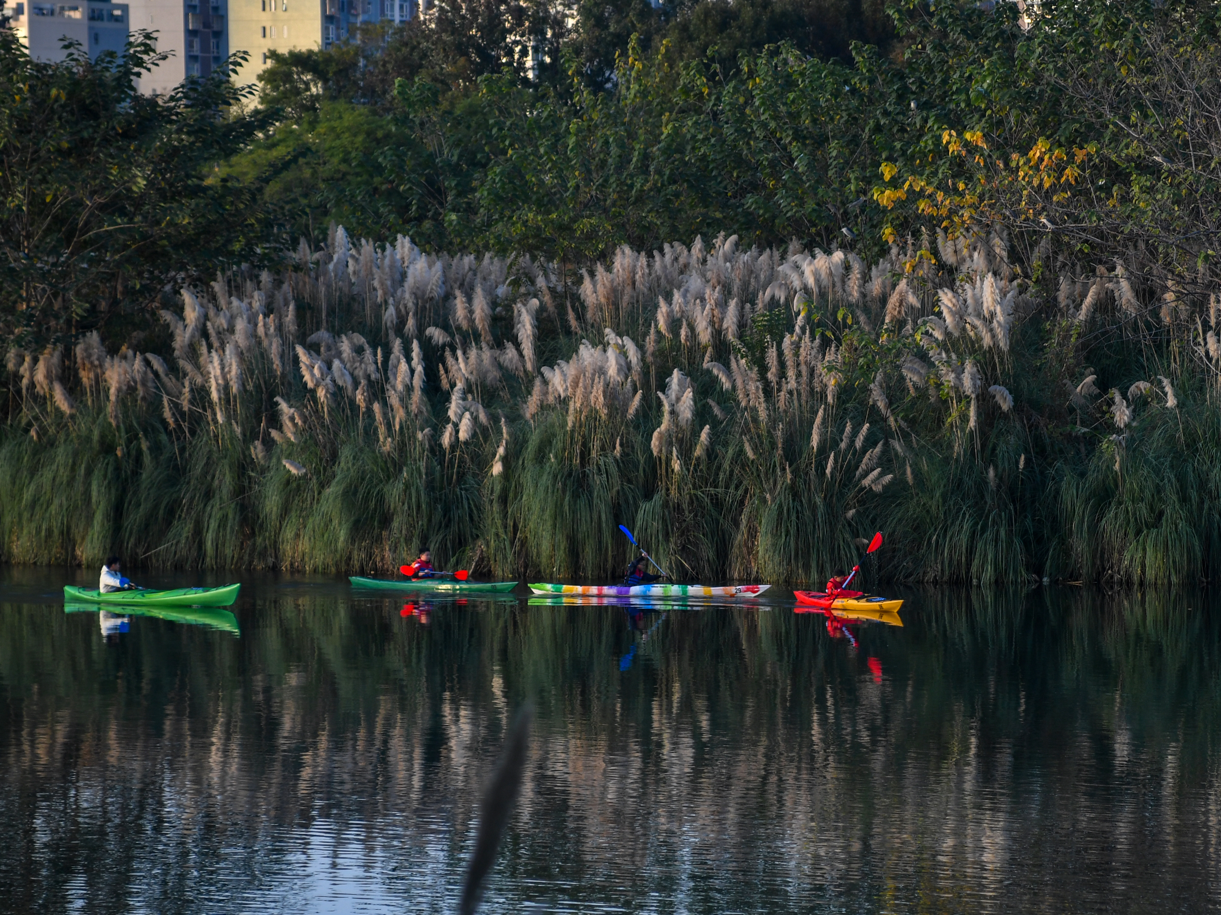 锦城湖公园,几位少年正在体验皮划艇运动,彩色的船身穿过一片芦花,显得格外鲜艳。