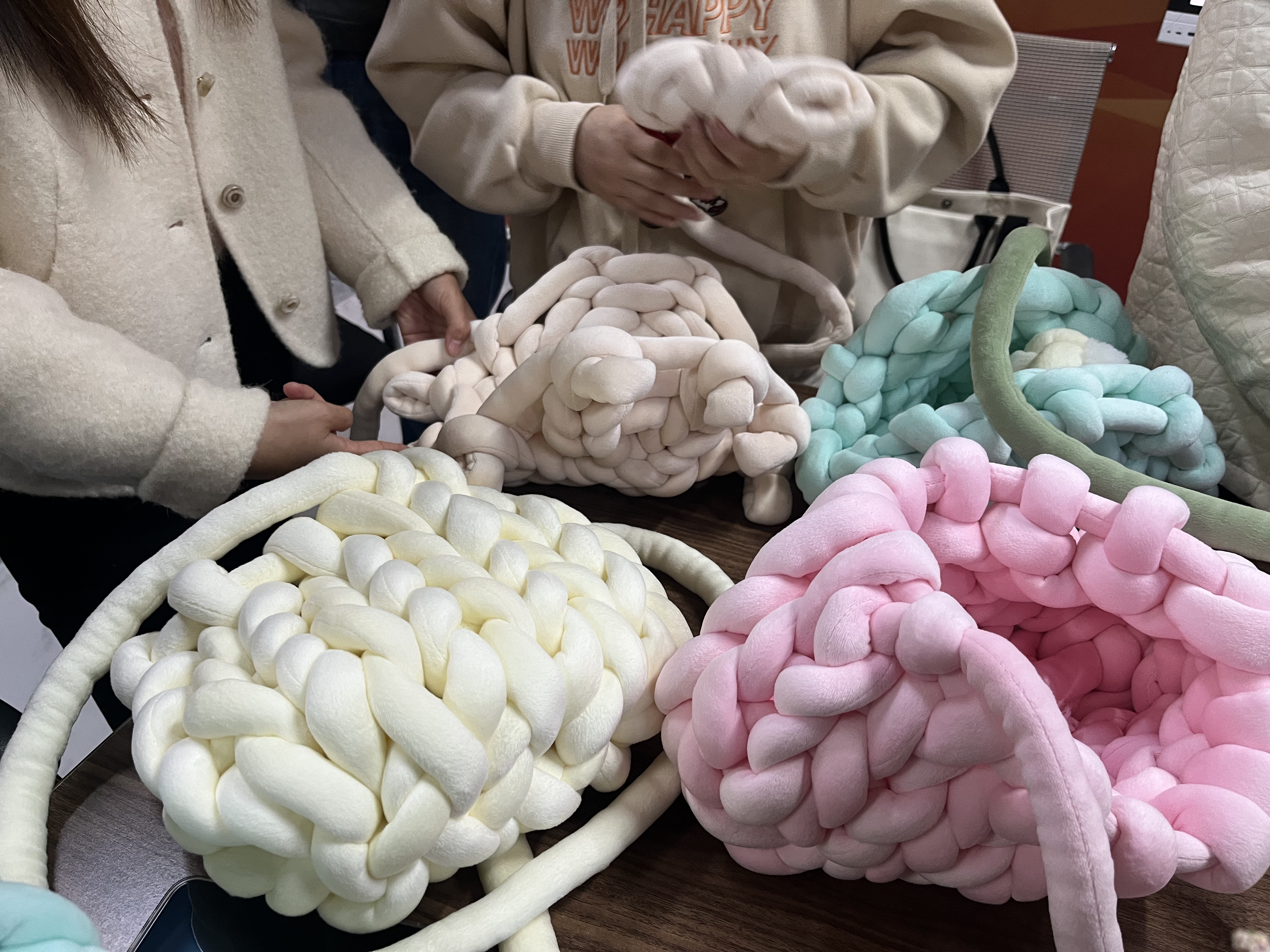 活动现场,手工老师从起针、绕线等基础步骤教起,手把手指导大家将粗毛线编织成兼具实用性与设计感的手工包。无需复杂工具,只需耐心缠绕穿插,一个个极具风格的编织包便在指尖逐渐成型。