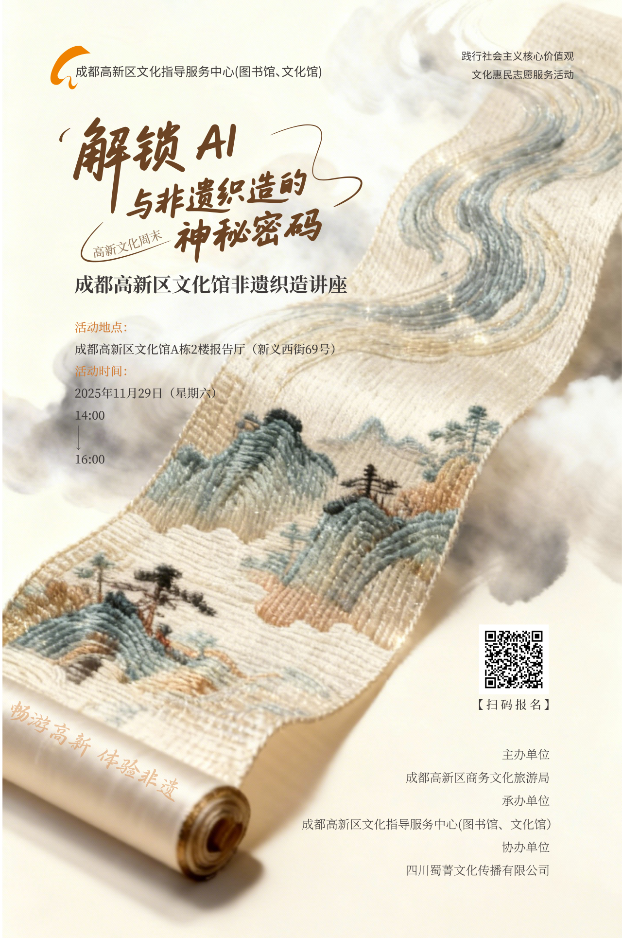 此次主题讲座将邀请公众走近非遗织造的历史,了解AI技术在图案复原、工艺优化与数字化传承中的应用实践,共同探讨传统技艺与现代科技的融合路径及未来趋势。现场还有蜀绣挂件制作体验环节,让参与者在亲手创作中直观感受非遗之美。