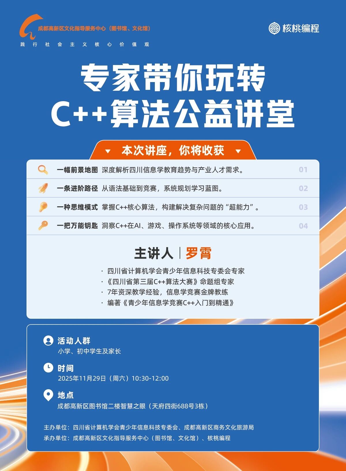 为助力青少年信息学能力提升,讲座特邀西南交通大学硕士罗霄老师主讲,解析四川信息学教育与人才需求,规划C++从基础到竞赛的系统学习路径,介绍C++在AI、游戏等领域的应用,为信息学爱好者搭建高效学习平台。