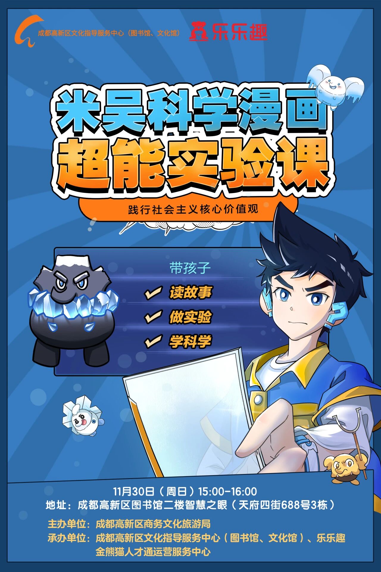 活动现场,孩子们将化身科学小侦探,通过角色扮演走进米吴的冒险世界,亲手完成“可乐变果汁”“平衡小人”等趣味实验,在动手实践中理解酸碱反应、重心平衡等科学原理,收获一次真正好玩又长知识的科学之旅。