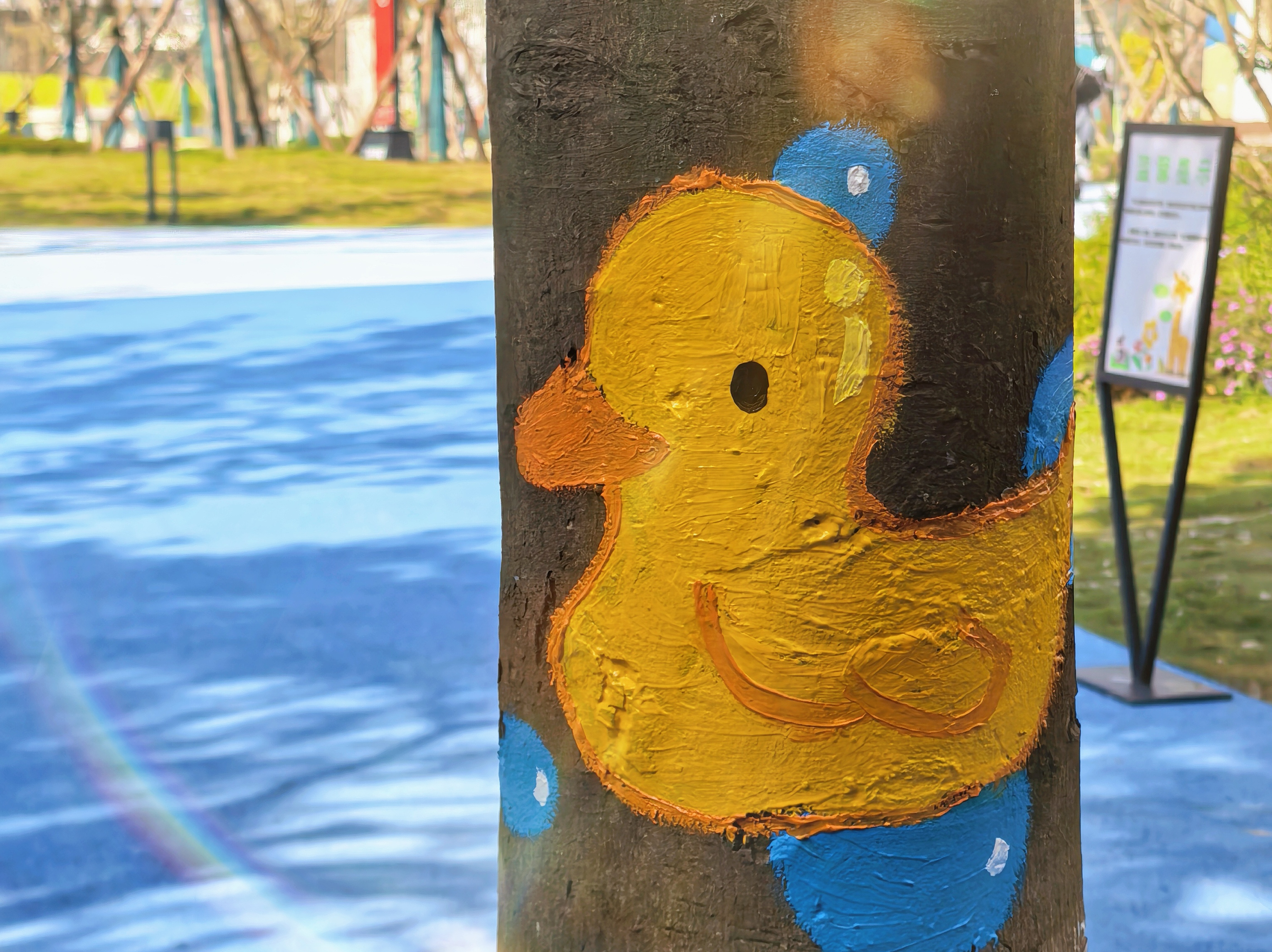 阳光透过枝叶洒下,给整个活动场景增添了几分暖意,学生们化身为“小画家”围聚在树干旁,手持画笔、蘸取颜料,在树干上精心勾勒线条、填充色彩。有的同学全神贯注,绘出憨态可掬的小黄鸭,鲜活的模样仿佛下一秒就要游向远方;有的同学灵感迸发,创作粉蓝配色的可爱形象,将树干变成了童话世界的入口;还有同学专注绘制“踩”上滑板的黄色星星,在树干上开启一场奇妙的星际滑行。