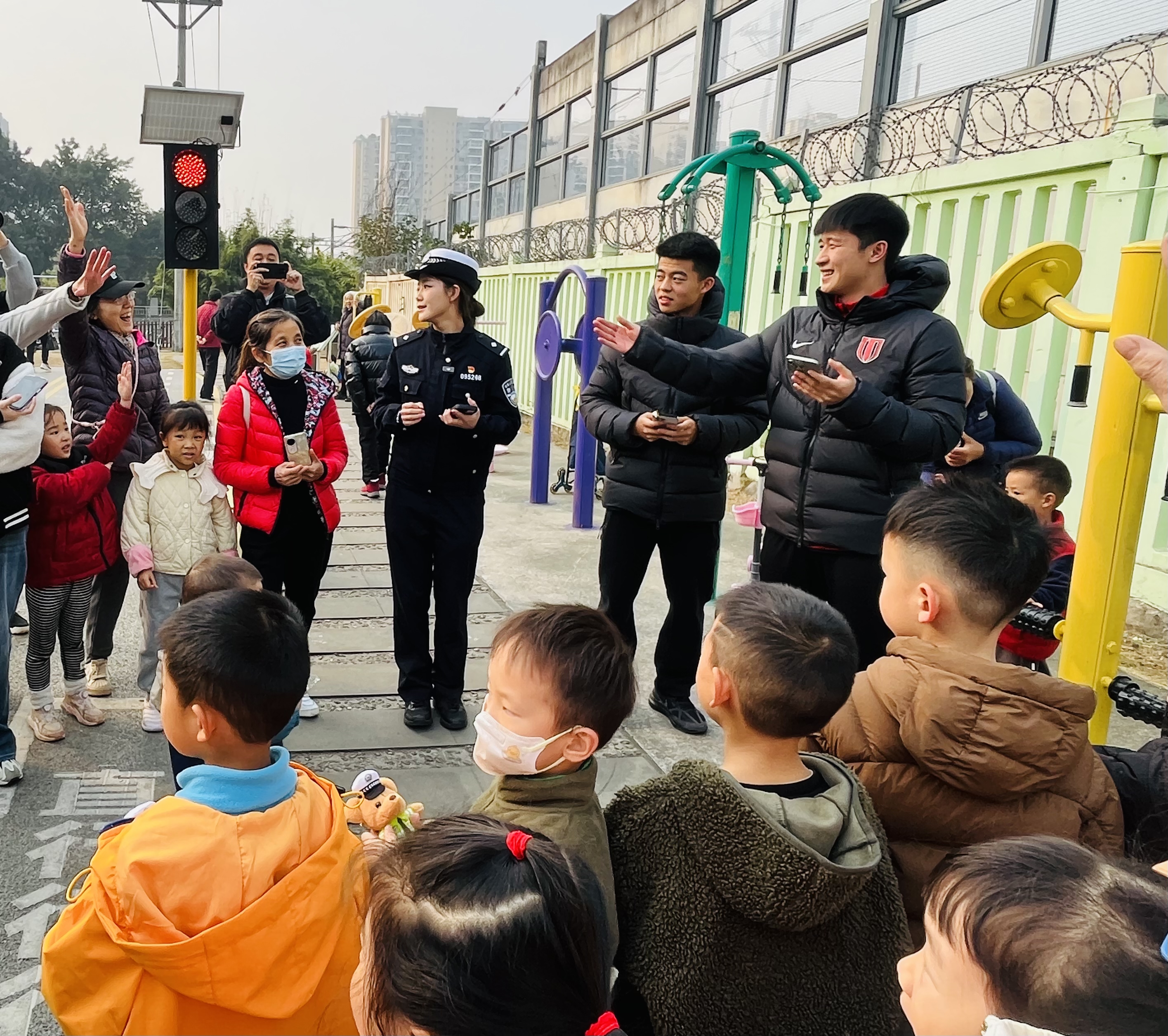 沉浸式体验环节中,两位球员与交警一起,带领孩子们穿行于模拟道路场景,手把手讲解交通标志含义,在轻松互动中帮助孩子们牢记“红灯停、绿灯行”“过马路走斑马线”等安全常识。