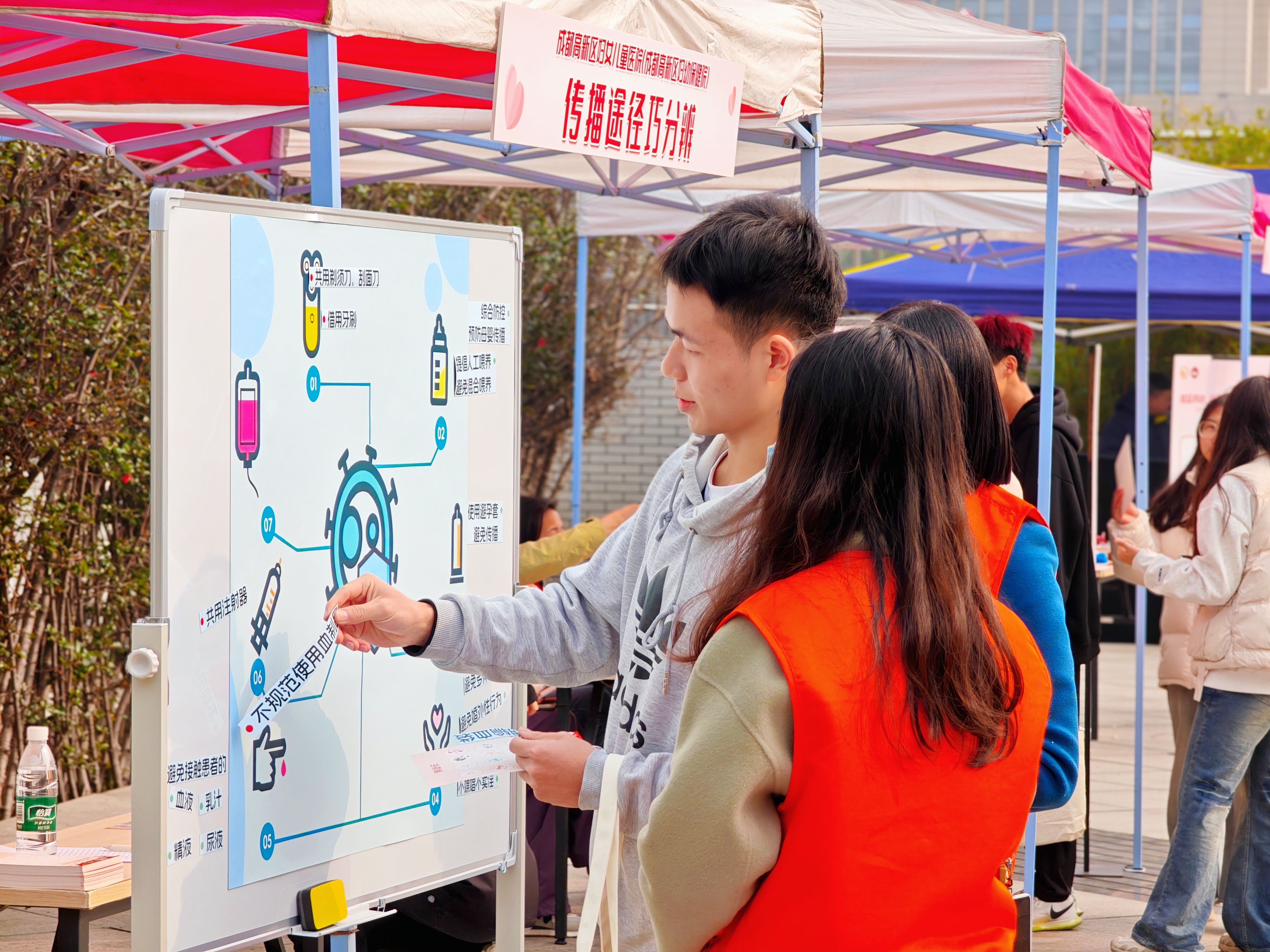 活动现场设置了多个创意互动关卡。在“传播途径巧分辨”环节,同学们通过卡片分类游戏厘清艾滋病传播的误区;“反歧视悄悄话传递”则以匿名留言方式,鼓励学生写下对艾滋病感染者的尊重与支持;“带好安全套,健康不掉线”通过模型实操教学,提升自我防护技能。成都高新区桂溪社区卫生服务中心设立的健康宣教点位、南新社区卫生服务中心提供的现场HIV免费检测服务,也受到师生广泛欢迎。