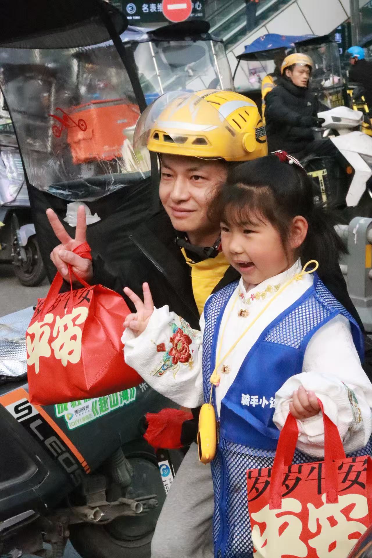 骑手和孩子拍照留念