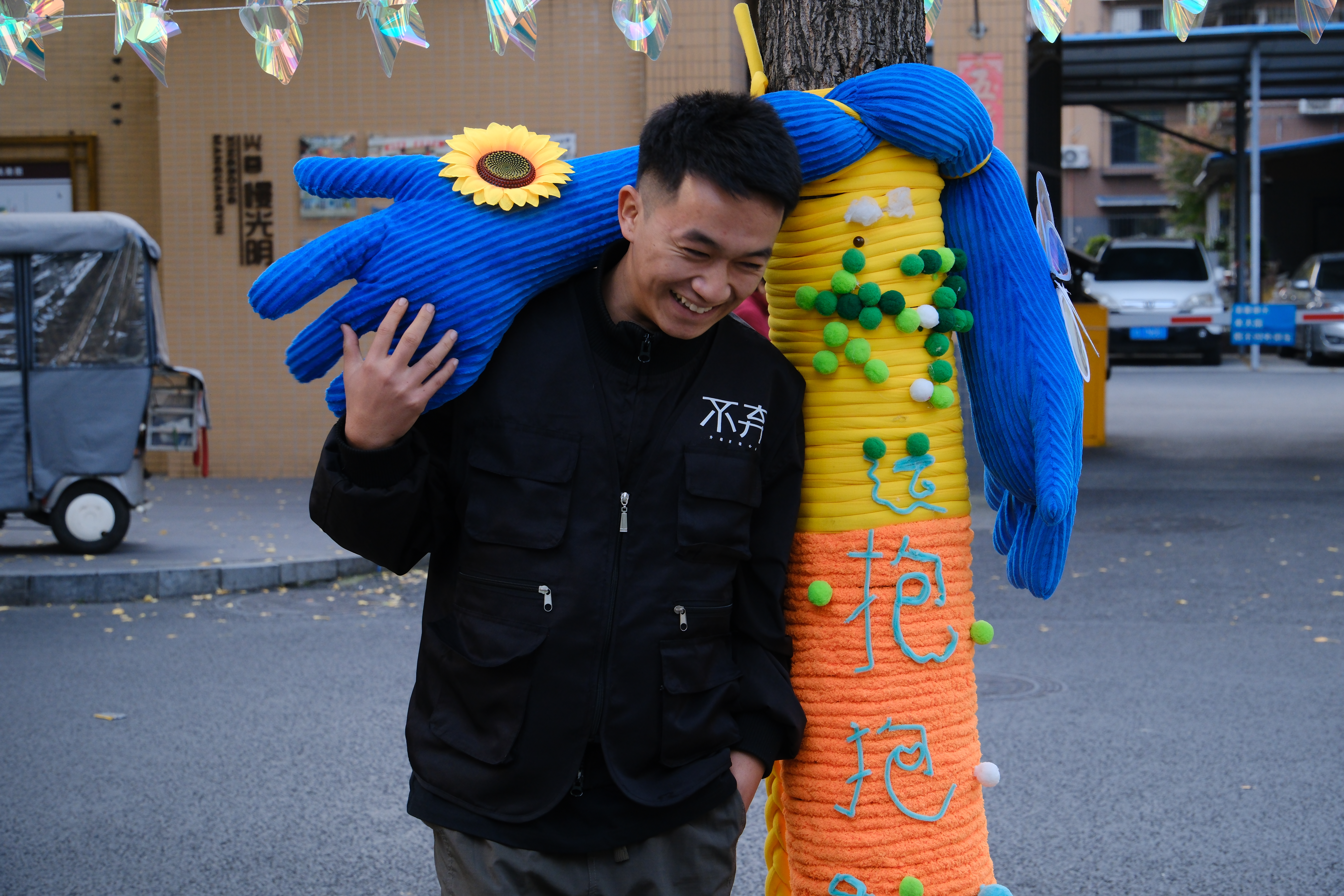 “之前在社交媒体上就看到大家转发‘抱抱树’回归的消息,今天终于见到了。”市民黄女士与朋友特地带上亲手制作的银杏叶伞前来打卡,“看到这些温暖的作品,真的会让人不自觉地想走近摸摸,感觉整条街都充满了温度。”