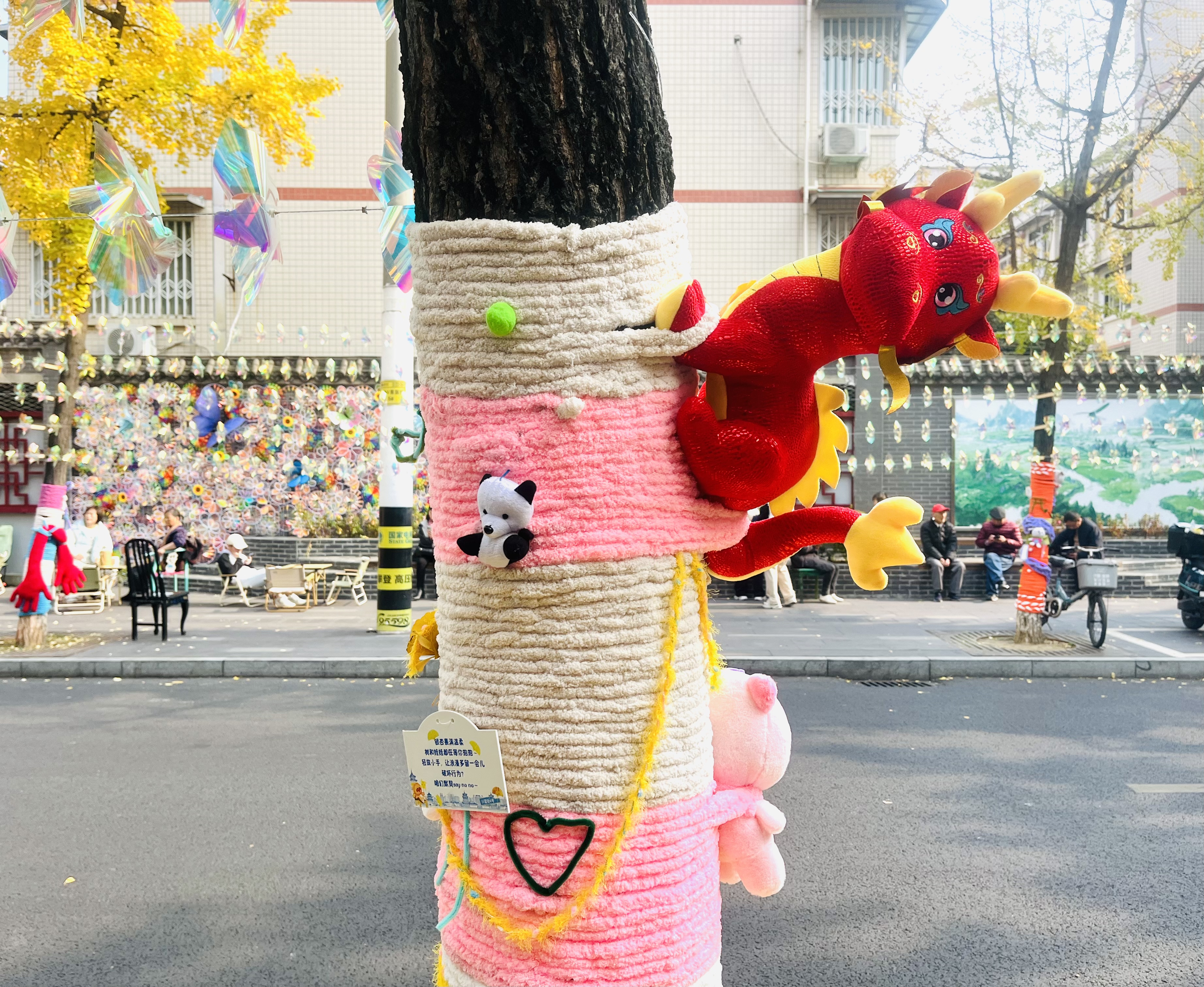 12月4日,记者漫步在兴蓉街,看到道路两旁的银杏树身披五彩毛线“新衣”,伸出一双双温暖的“手”,静待路人的拥抱。这些“抱抱树”有着明亮的撞色搭配、精巧的编织纹理,部分树干还缀有可爱玩偶或民族风图案,与一地金黄的银杏落叶相映成趣。