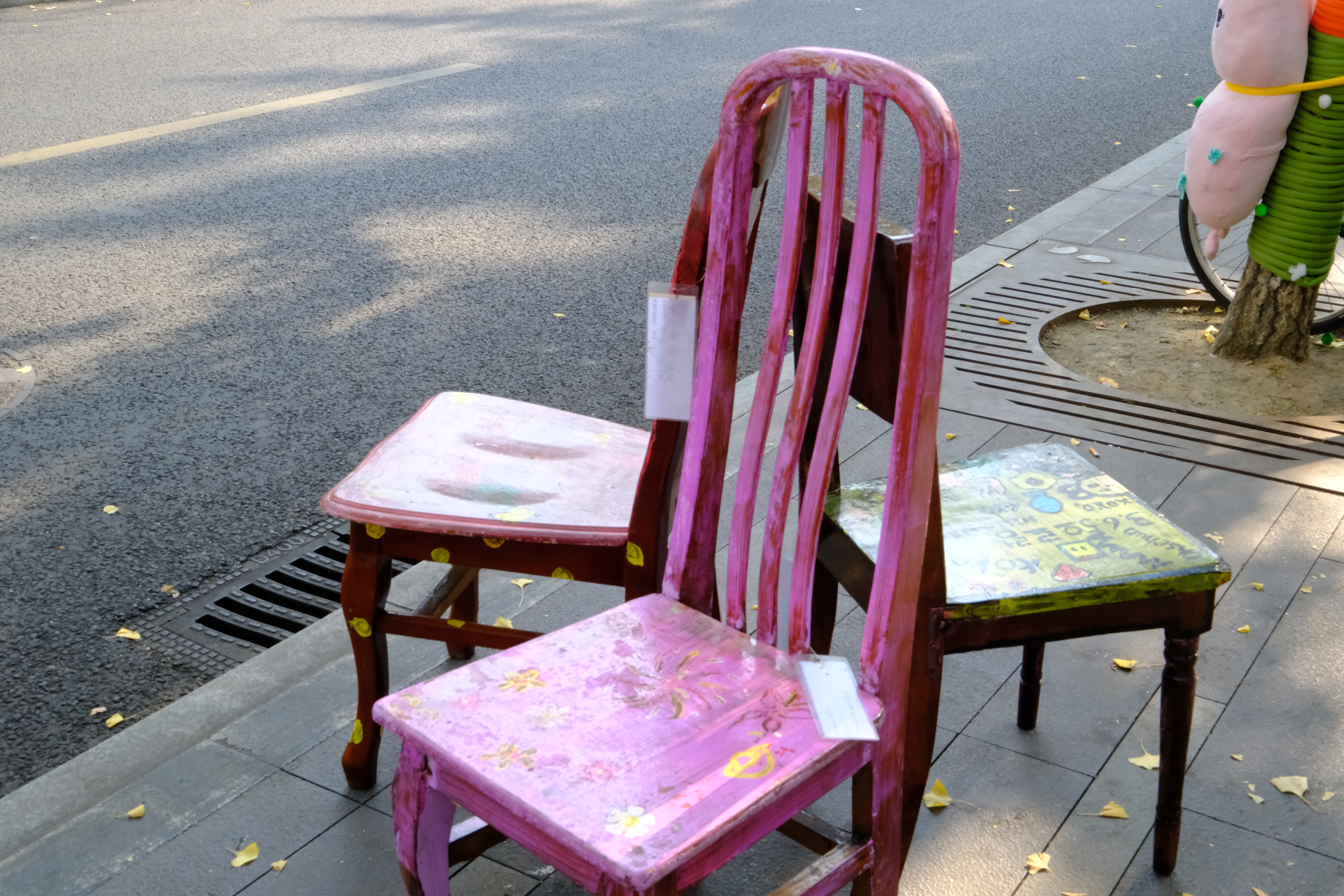 与“抱抱树”相映成趣的,是今年全新亮相的“老木凳”系列。这些凳子原本是居民家中闲置或院落里散放的旧板凳。在兴蓉社区合伙人蒋子翰的发起下,居民们动手打磨修补,再刷上颜料,绘出各种充满生活意趣的图案。经过一番改造,承载着巧思与记忆的板凳焕然一新,被重新安放在街边树下,成为供人歇脚、赏景的温馨角落。
