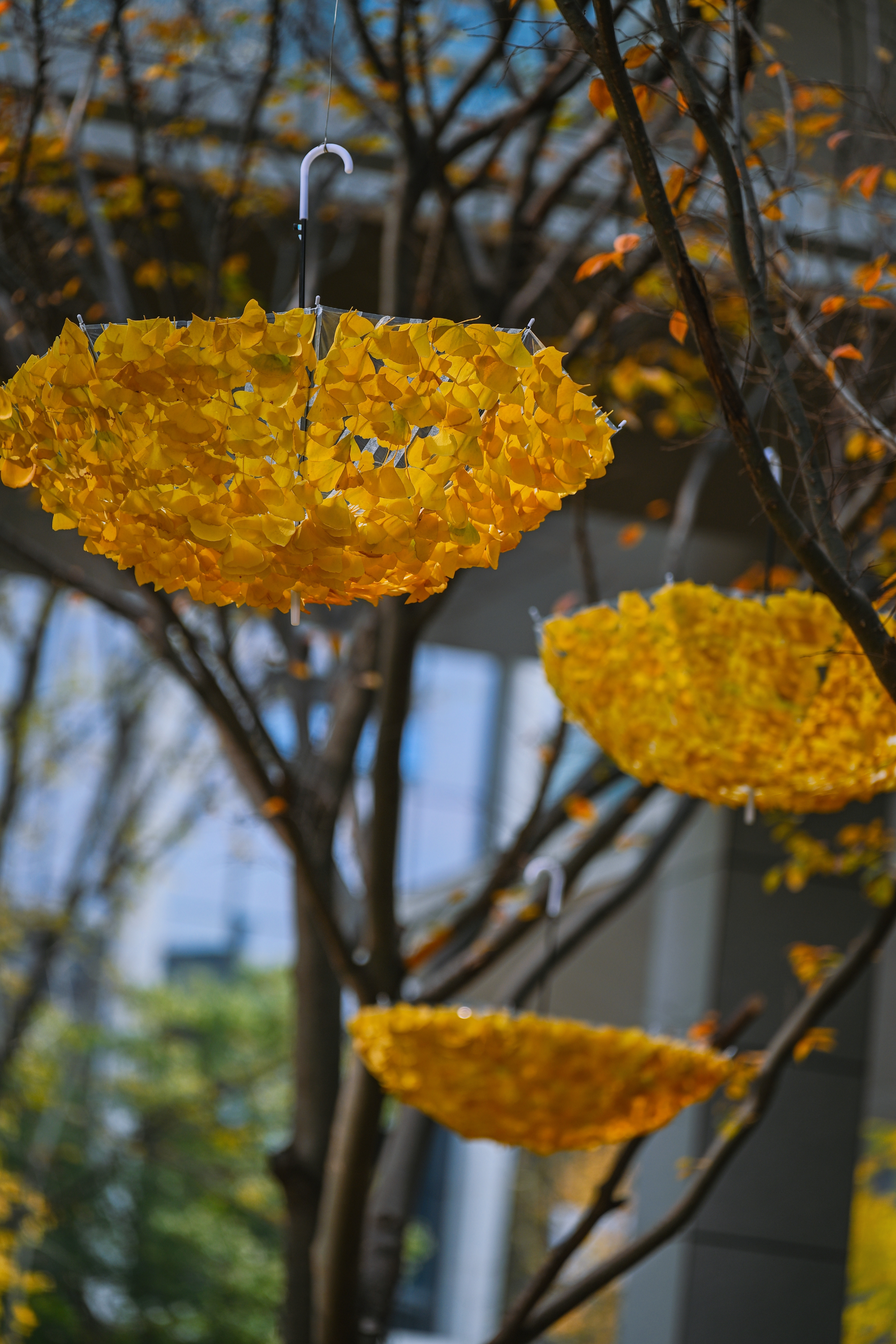 而金黄灿烂的银杏叶也成为园区物业人员的灵感来源。只见原本平淡的木框架,经由一片片银杏叶的点缀,便成为一扇扇浪漫的“时空之门”。而透明雨伞也“借”来金黄银杏叶,当作自己的冬日“大衣”,悬挂在树枝间就成了一朵朵“花伞”……面对这样诗意和浪漫的场景,每当有企业员工走过时,视线和脚步便被牢牢锁定,纷纷前去拍照打卡,用镜头记录下这份独特的冬日色彩。