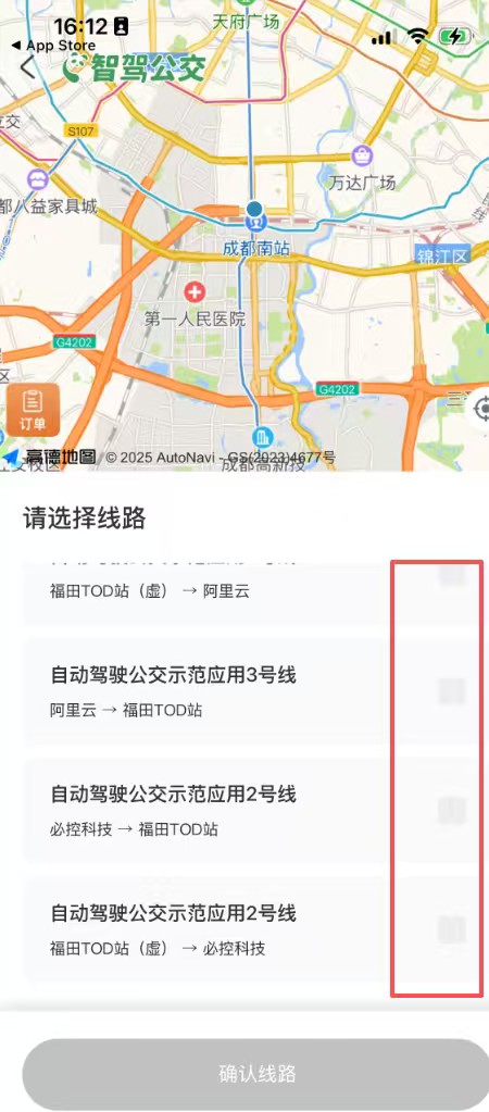 乘客可通过成都公交小程序或APP预约乘车,具体流程为:选择“智驾公交”板块,同意乘车安全服务告知并通过权限校验,选定线路及站点后预约班次,填写乘车人数与联系电话并确认协议,发车前系统将生成乘车二维码供核销使用。同时,乘客需遵守安全乘车须知,全程系好安全带,不得在车厢内站立或随意走动,严禁触碰车内自动驾驶设备。