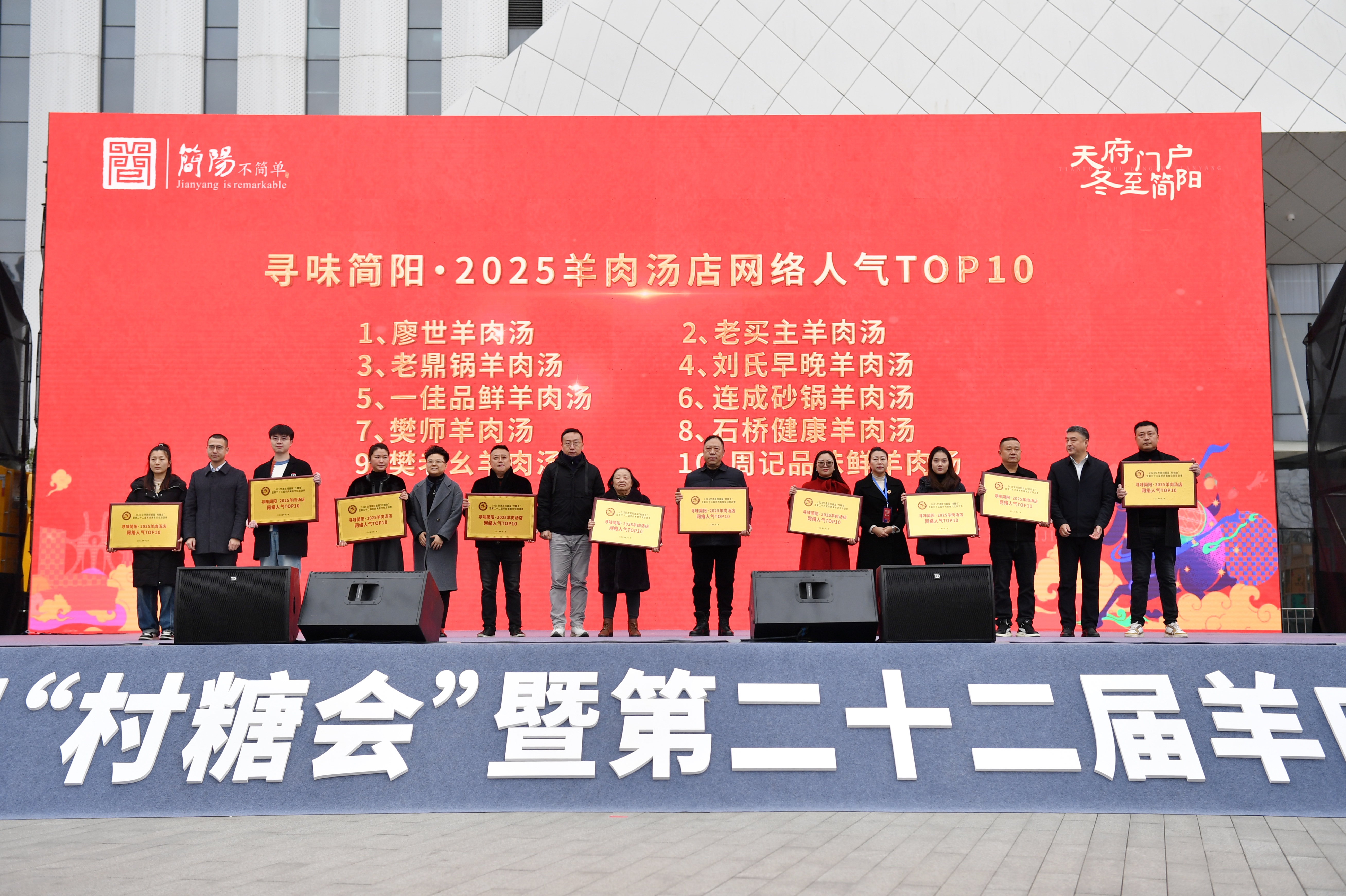 活动现场,6位简阳乡村振兴代表集体登台,化身“村糖会”推介官,为简阳羊肉、尤克力柠檬、简州晚橘等本土乡村优品倾情代言。一系列重磅成果同步发布:简阳农业公共品牌“蜀之东篱”与北京天坛的联名新品惊喜亮相,“地标匠心・非遗传承——简阳羊肉汤非遗地标品质”正式推出,“简阳必体验・2025十大美食美景美物榜单”权威发布;“寻味简阳・2025羊肉汤店网络人气TOP10”评选结果揭晓,授牌简阳籍网红获授“简阳文旅推介官”称号。