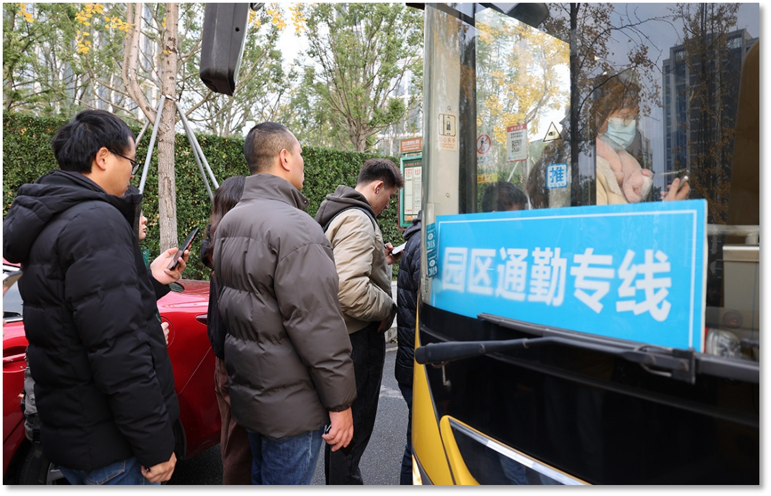 园区还根据入驻企业交通需求,动态优化公交接驳路线,开展众筹公交服务,通过“微循环+招手即停+企业定制”等方式,提升职工的通勤便利性,构建“人到即服务、楼成即通车”的交通响应机制。