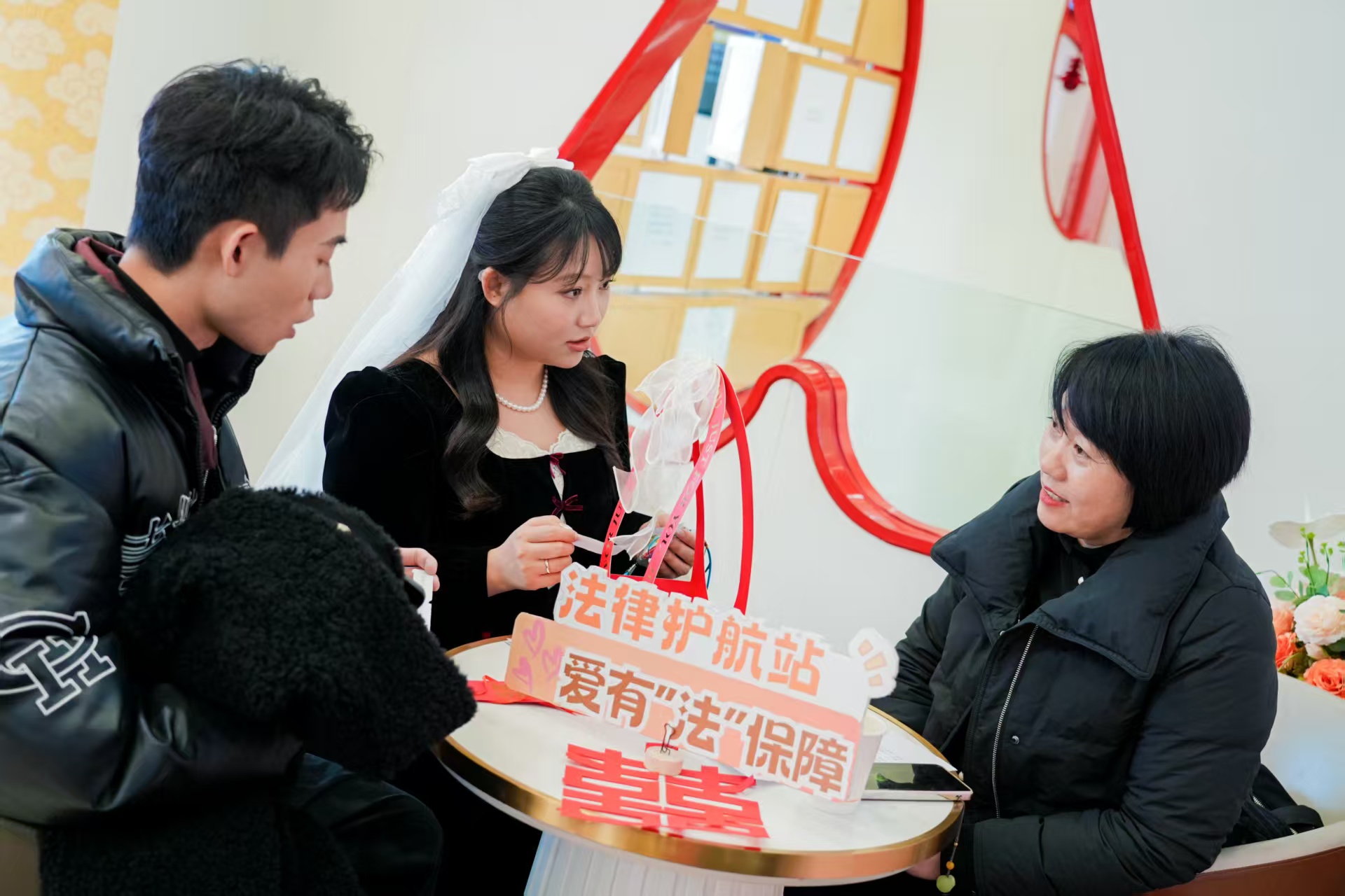 本次活动摒弃传统说教模式,巧妙设计了4个特色鲜明的互动点位,形成一条连贯的体验动线。新人们在“新风手工坊”携手制作缀有文明婚俗标语的香囊,于指尖创意中传递简约新婚尚;在“婚姻问卷站”通过“新婚十问”,分享彼此对婚姻的期待与思考,为精准服务提供依据;在“婚姻辅导站”,专业辅导员就冲突管理、婚俗观念沟通等常见议题进行集中微辅导,并贴心提供一对一个性化咨询;尤为引人注目的是“法律护航站”,这里将婚前财产约定、夫妻共同财产规划、彩礼新风等关键法律知识,转化为“增情式”的互动问答。诸如“想把对方名字加在房产本上,法律上代表什么心意?”等贴近生活的问题,引发新人热烈讨论与甜蜜互动,在轻松氛围中悄然掌握了权益保障常识。