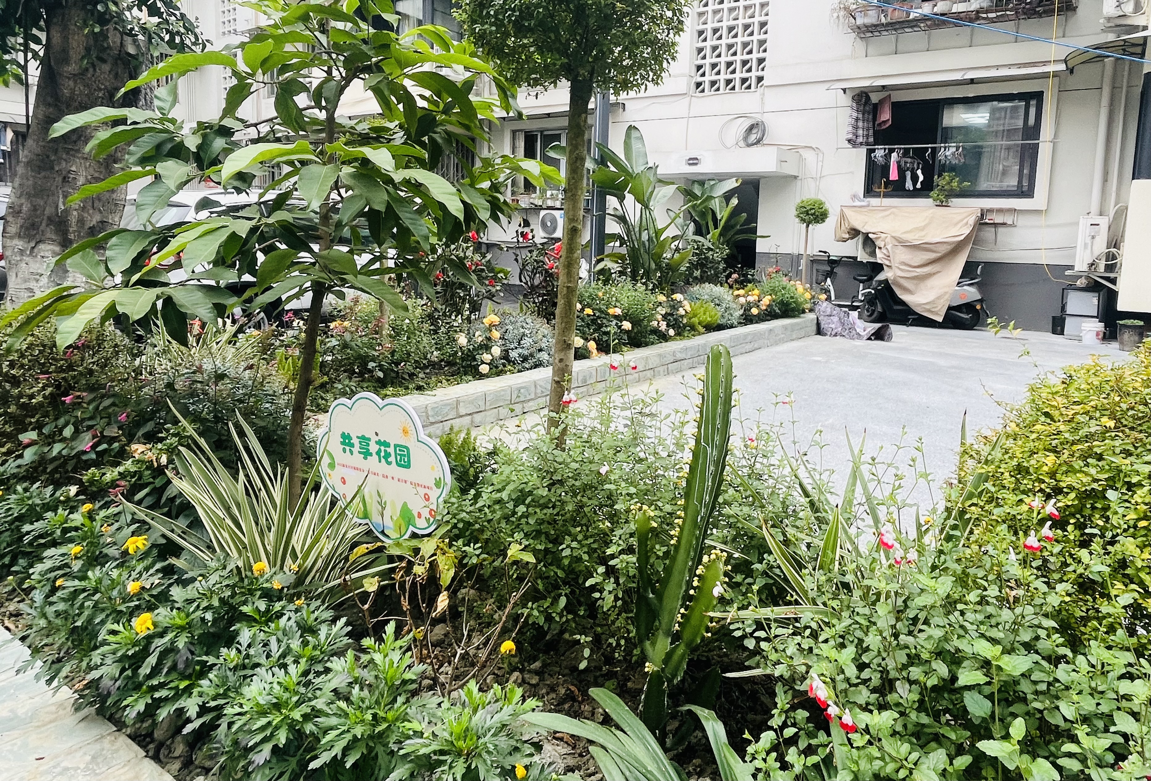 共享花园里,是生机勃勃的各种植物;而花园一侧,彩绘墙色彩明快、主题鲜明,与植物的绿意相映成趣,处处洋溢着生机盎然的气息。但谁能想到,这片如今充满生机的休闲空间,曾经竟是一块无人问津的闲置绿地。