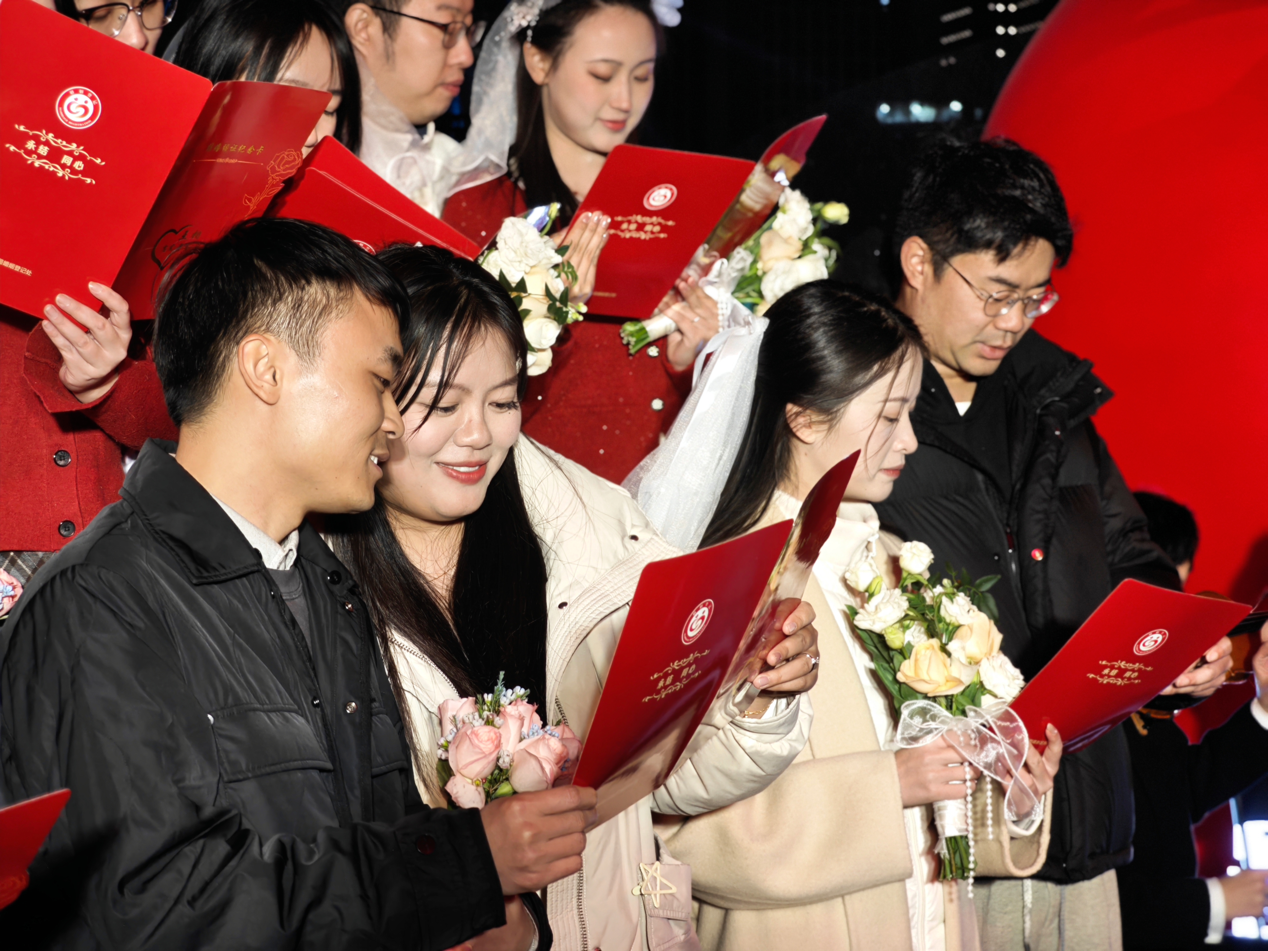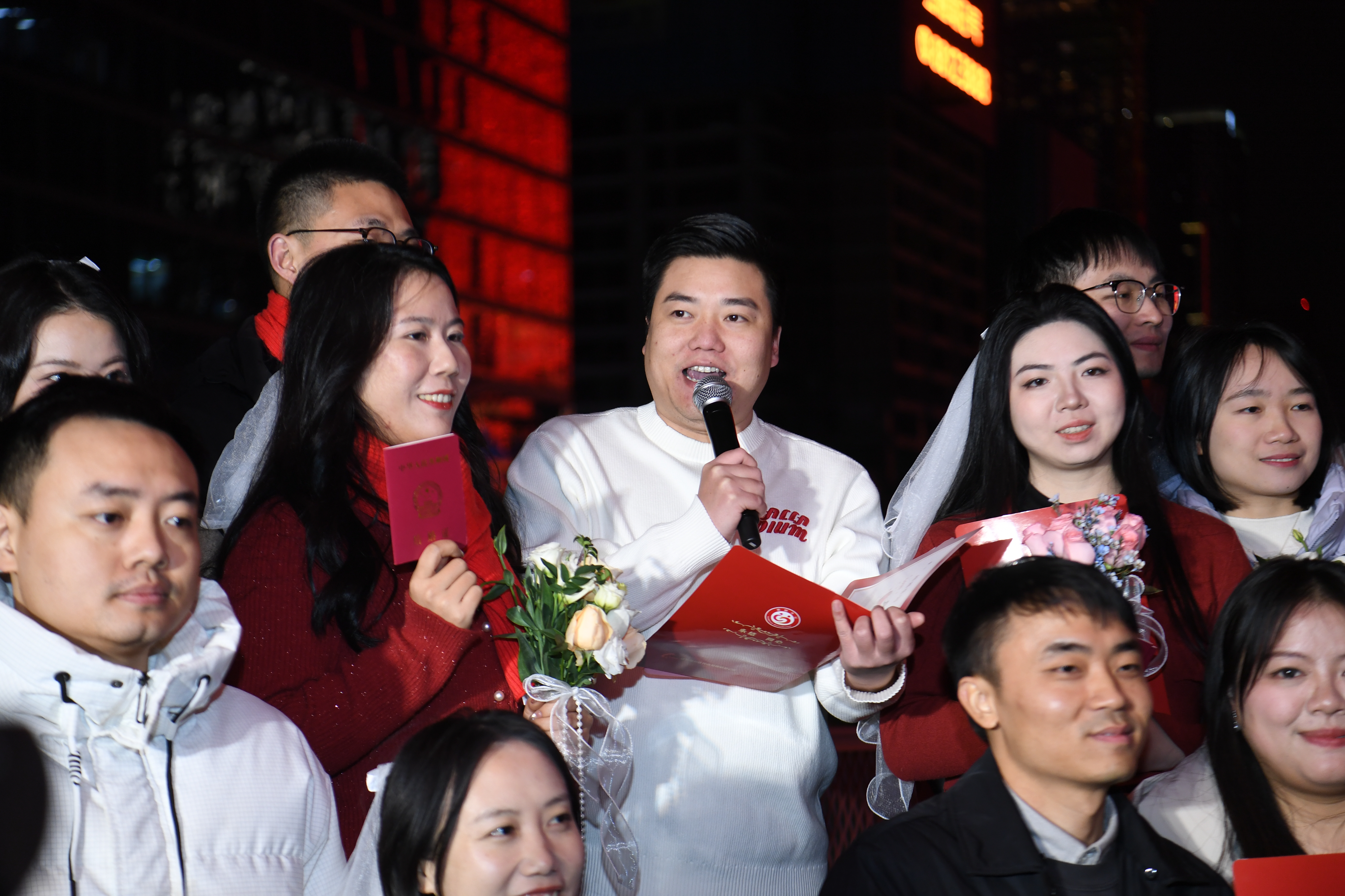活动现场,成都高新区婚姻登记处举办了集体颁证仪式,8对新人在璀璨灯光与城市地标的见证下领取结婚证,共读结婚誓词,许下相伴一生的郑重承诺。