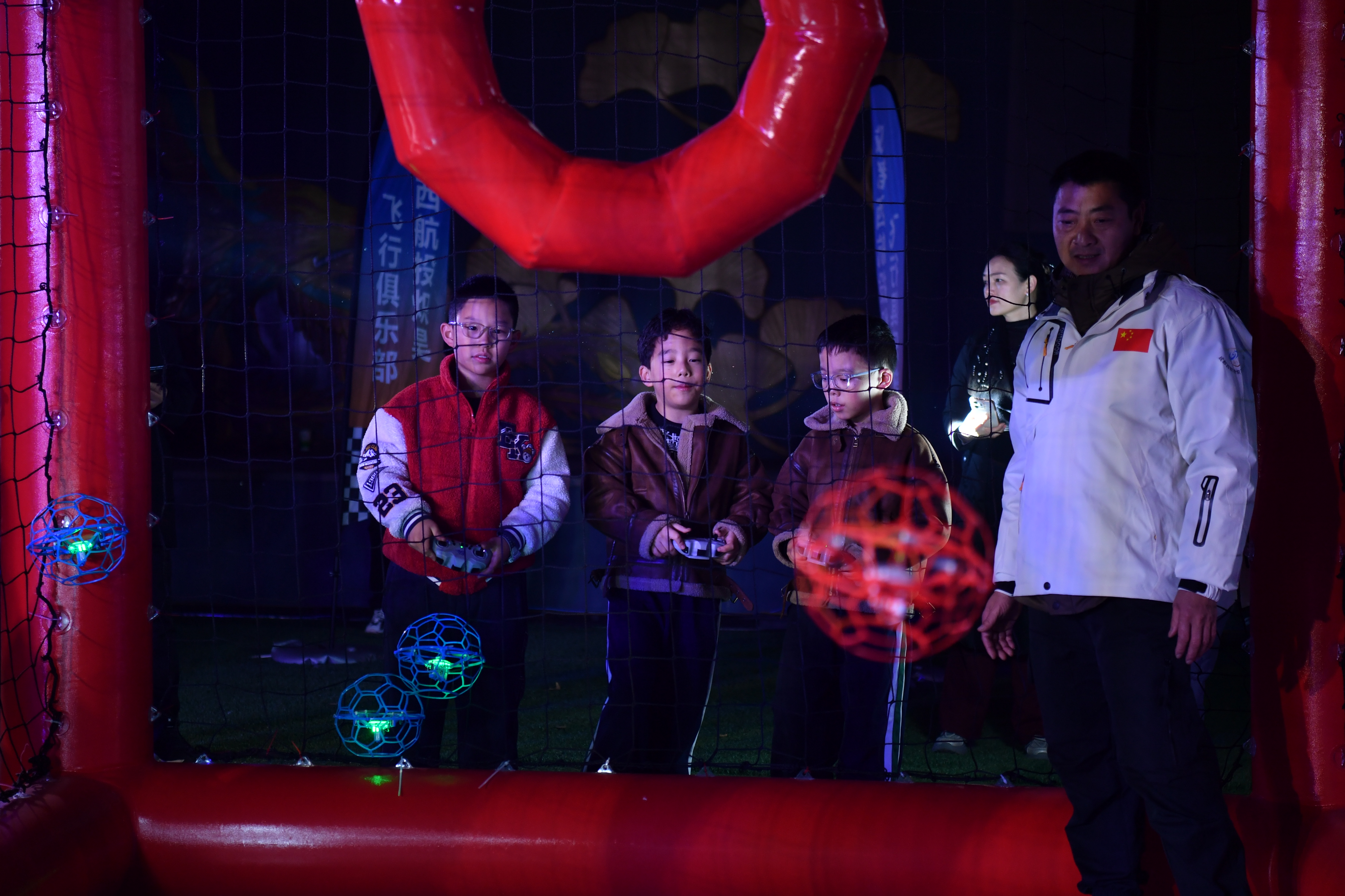 无人机在现场表演了一场3V3空中足球对决