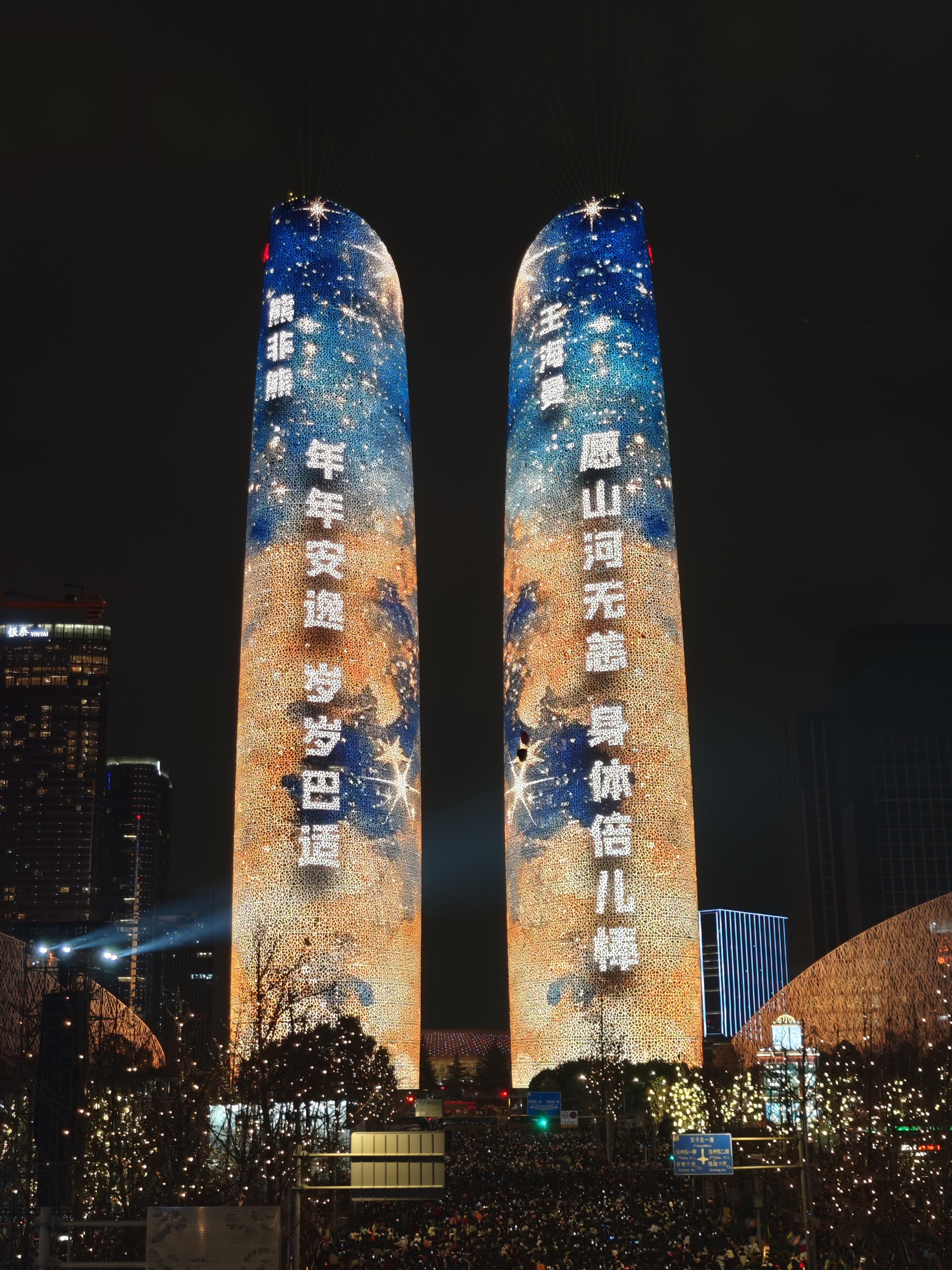 伴随着“10、9、8……3、2、1!新年快乐!”的倒计时声,12万余人齐声呐喊,声音穿透夜色,将期待值推至顶峰。零点一到,双子塔瞬间被点亮,“2026”与“新年快乐”的金色大字跃然塔身。新年的祝福声与欢笑声交织,现场暖意融融,大家纷纷定格跨年最美瞬间。