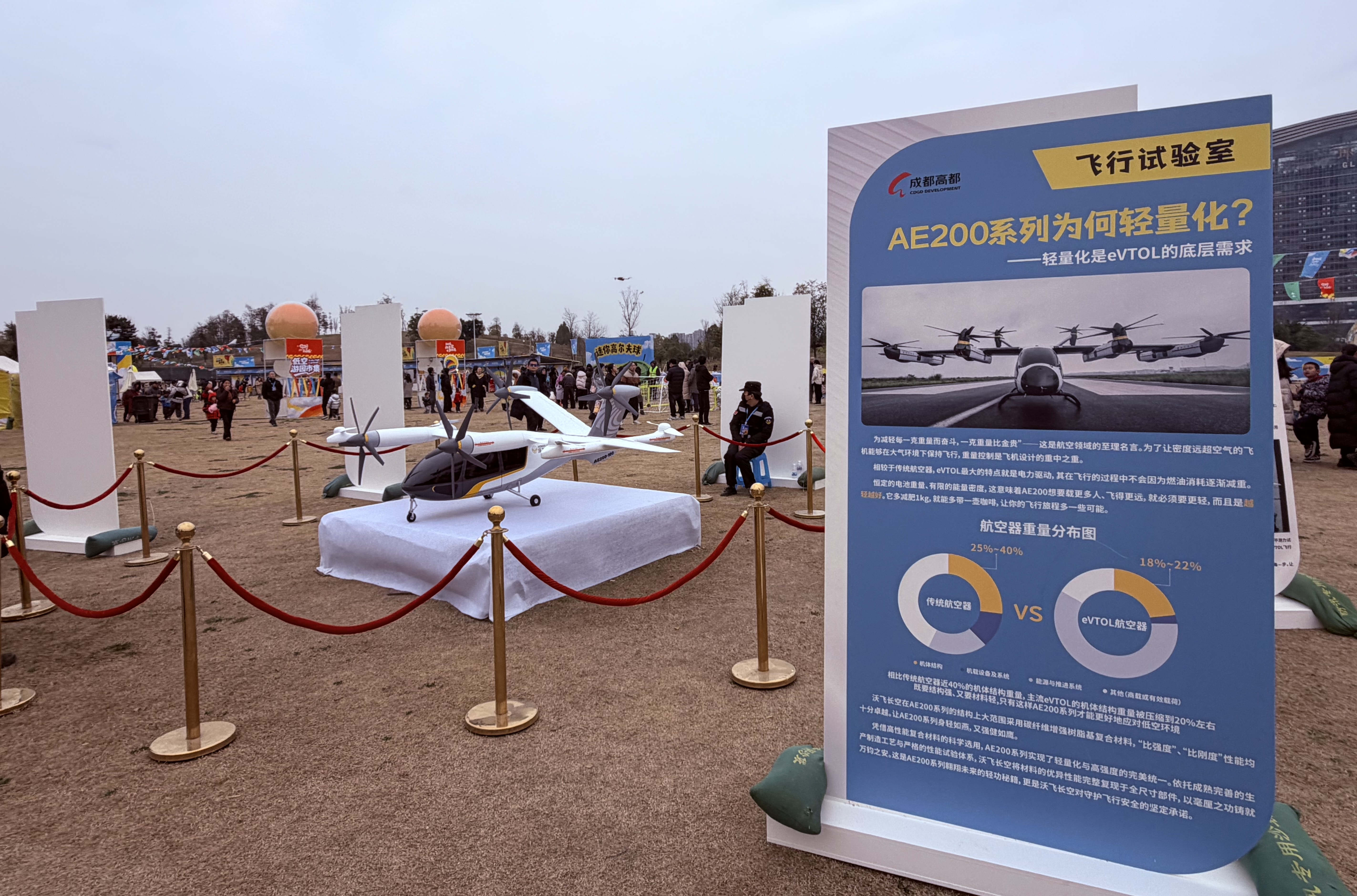 低空科技展示是本次活动的核心看点之一。现场展出的沃飞AE200电动垂直起降飞行器(eVTOL)复刻模型,直观呈现了城市空中交通(UAM)的未来形态,成为市民游客争相合影的“未来明星”。在分会场成都SKP星空露台,AW109直升机静态展示吸引大量市民驻足,在专业人员的讲解下,公众得以近距离了解低空通勤、航空安全等相关知识。通过沉浸式展示与现场科普,成都高新区将低空产业链上的关键技术节点,转化为一堂面向全民的“科技公开课”,让前沿科技真正变得可触、可感、可体验。