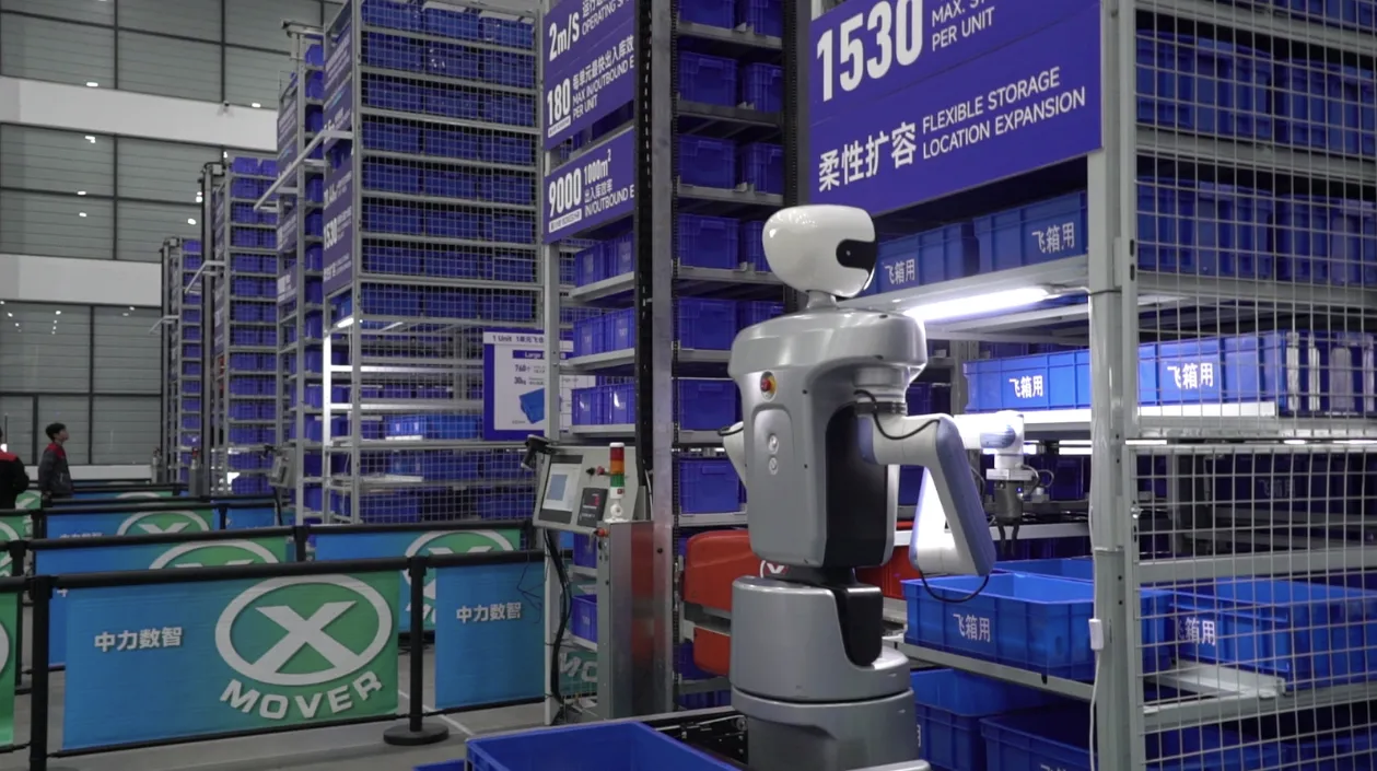 在测试中心,记者看到,一台上半身人形、下半身轮式底盘的具身拣选机器人正在进行零件拣选与配送工作。面对不同形状、不同大小的零件,机器人可以“聪明”地进行识别,并根据该零件适合的拣选方式,选择左右两只机械手臂中的一只进行拣选。据介绍,该方案先由飞箱机器人用数秒时间,将货架上任意位置的料箱移动到拣选点,再通过具身拣选机器人拣选零件、具身配送机器人进行配送,以极高的效率完成从仓库拣选到工位配送的全流程,覆盖从电商零售到智能制造的多元场景。