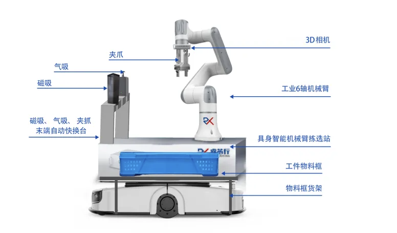 此外,针对更复杂的拣选场景,睿芯行首创了可实时切换机械手臂末端的具身智能拣选站,该方案通过视觉感知或信息交互,识别多种形态的零件,并实时选择不同的机械手臂末端执行器(如夹爪、气吸、磁吸、灵巧手等)进行高效抓取,完成无人化拣选工作。