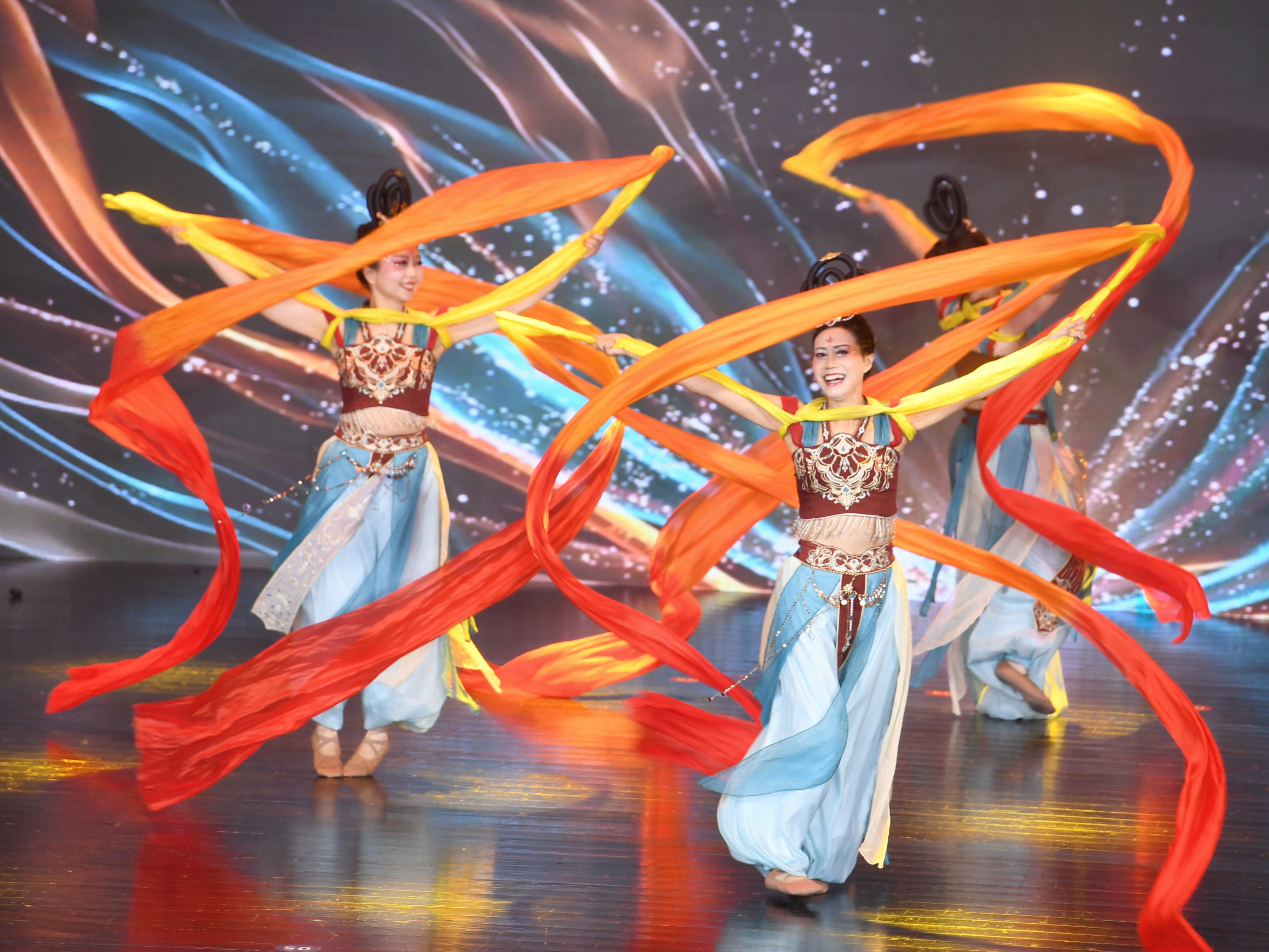 文艺展演中,舞蹈《伎乐飞天》让千年敦煌壁画翩然重生,舞蹈《锦绣》依托千年织锦的瑰丽,舞出中华文明的风采;时装秀《蜀锦·五星出东方》更将国家级文物“穿”上舞台,曲裾飘逸、纹样生辉;歌曲《蜀道新歌》则讴歌了四川从“蜀道难”到“天堑变通途”的沧桑巨变,赢得观众阵阵掌声,《黄河大合唱》选段气势如虹,点燃全场爱国豪情。