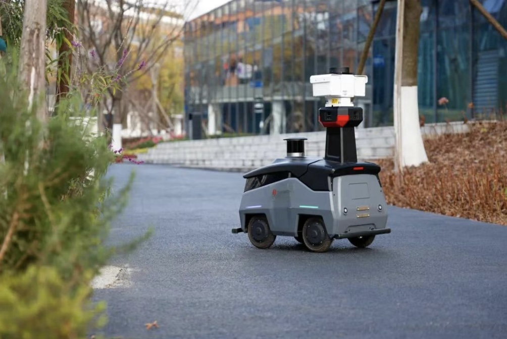 在园区的主干道,一辆轮式无人巡逻车正沿着预设路线平稳巡航,开展园区公共区域的例行巡查。它具备高精度定位和基础避障能力,能自主绕行行人或临时障碍物。目前,机器人大脑技术创新中心已在相关道路完成了路径规划,并建立了无堆放物的基准状态模型。当无人车靠近正在装修施工的场地时,无人车发现异常,会将现场画面同步回传至后台管理界面,便于工作人员在后台主动发现安全隐患,及时做出响应。
