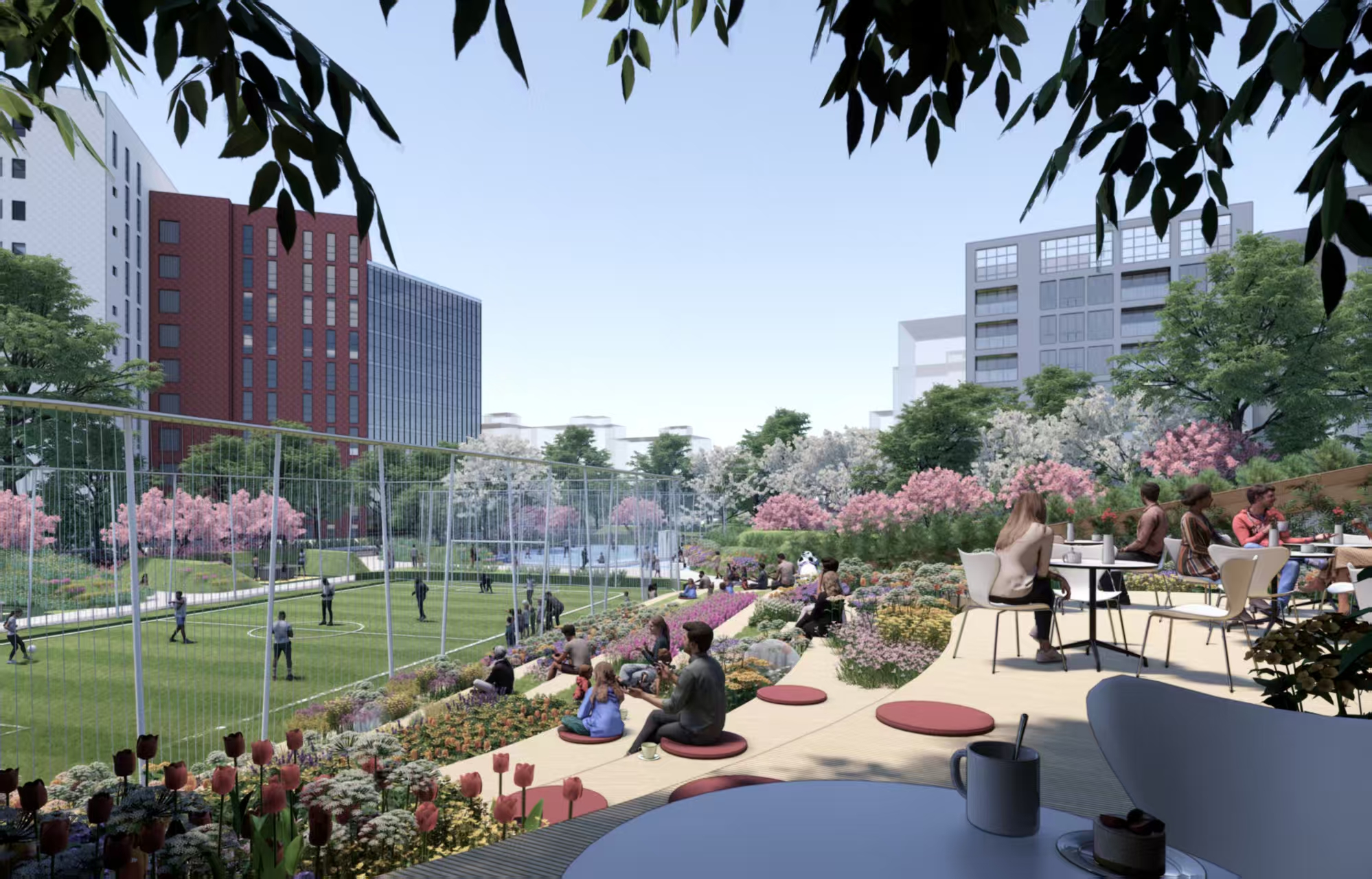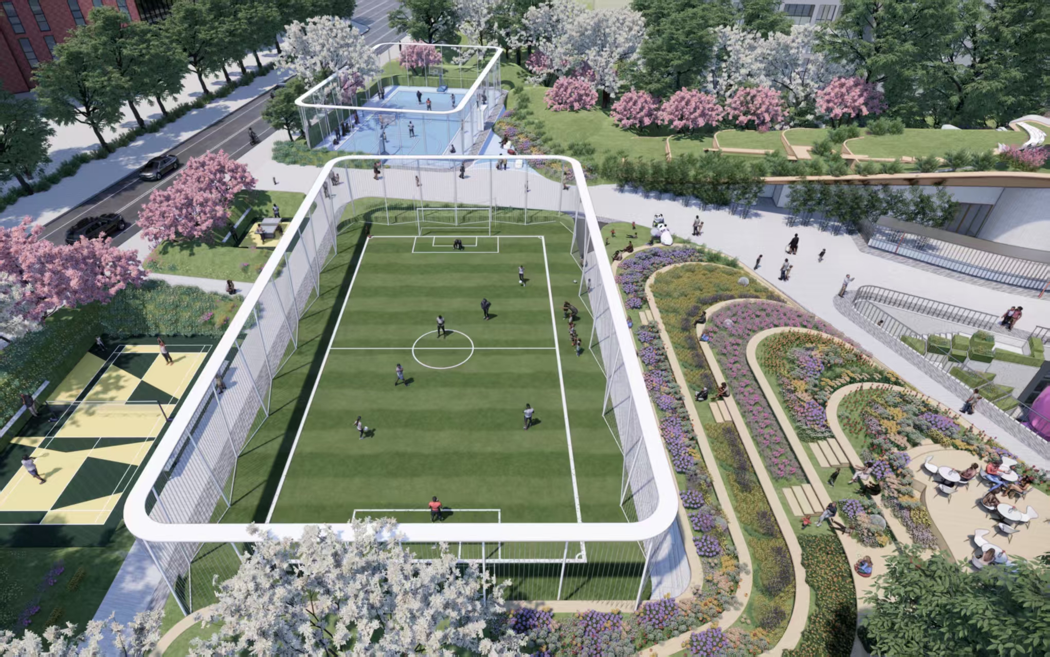 在功能全龄覆盖上,项目精准对接民生需求,核心建设内容涵盖社区级体育空间、两栋城镇服务设施用房与配套地下停车场,全面覆盖居民多元生活需求。其中,社区级体育空间以社区运动公园为核心,规划了篮球、足球、羽毛球、乒乓球等运动场地及综合健身区,助力营造全民健身的浓厚氛围,打通居民“家门口健身”的“最后一公里”。
