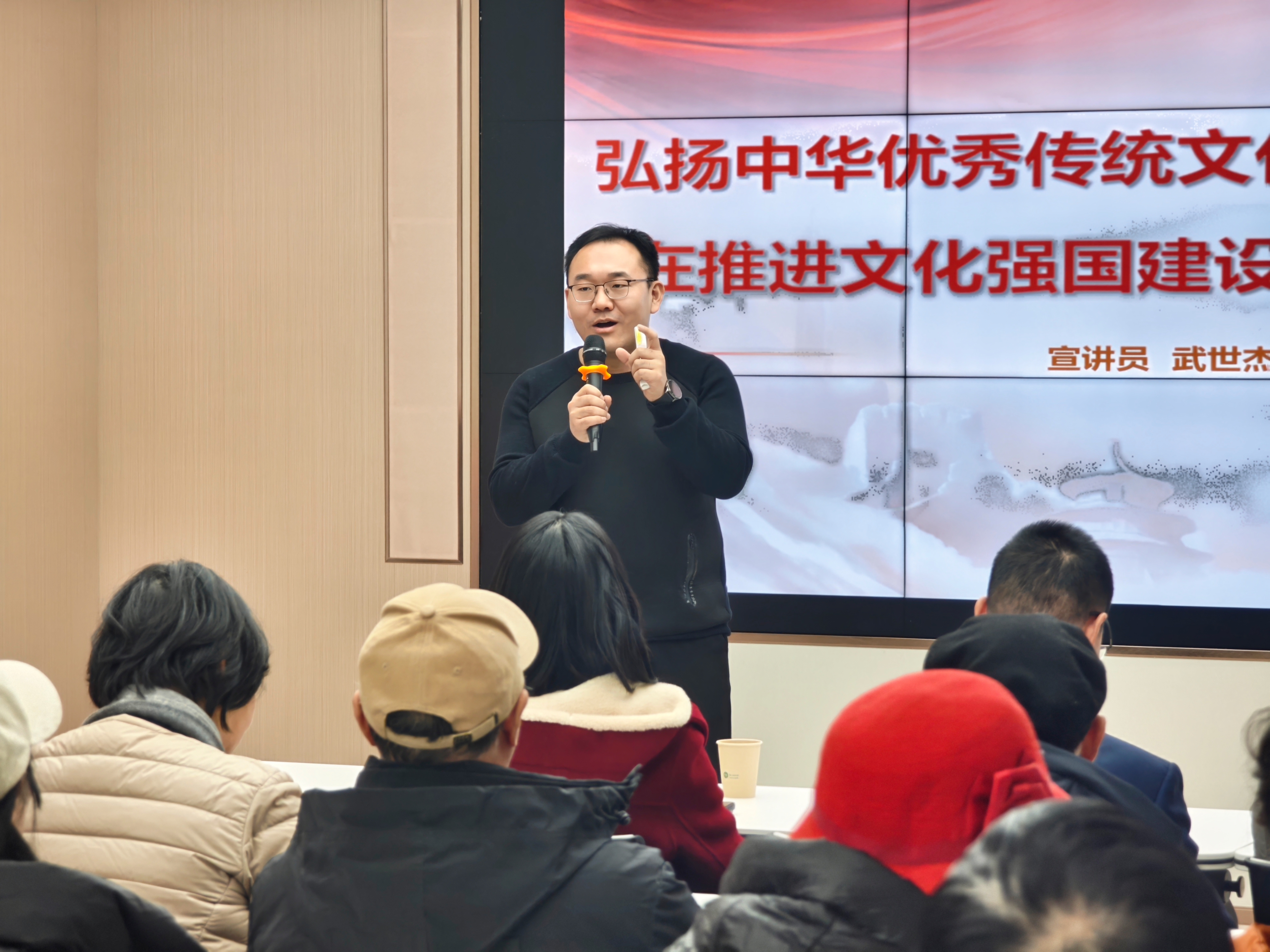 武世杰将坚定文化自信与贯彻落实党的二十届四中全会精神紧密联系,呼应国家“十五五”规划建议的相关部署,引导听众深入理解推动文化“两创”(创造性转化、创新性发展)的重要意义,激励大家在文化强国建设中坚定前行。宣讲深入浅出、引人共鸣,现场气氛热烈,掌声不断。