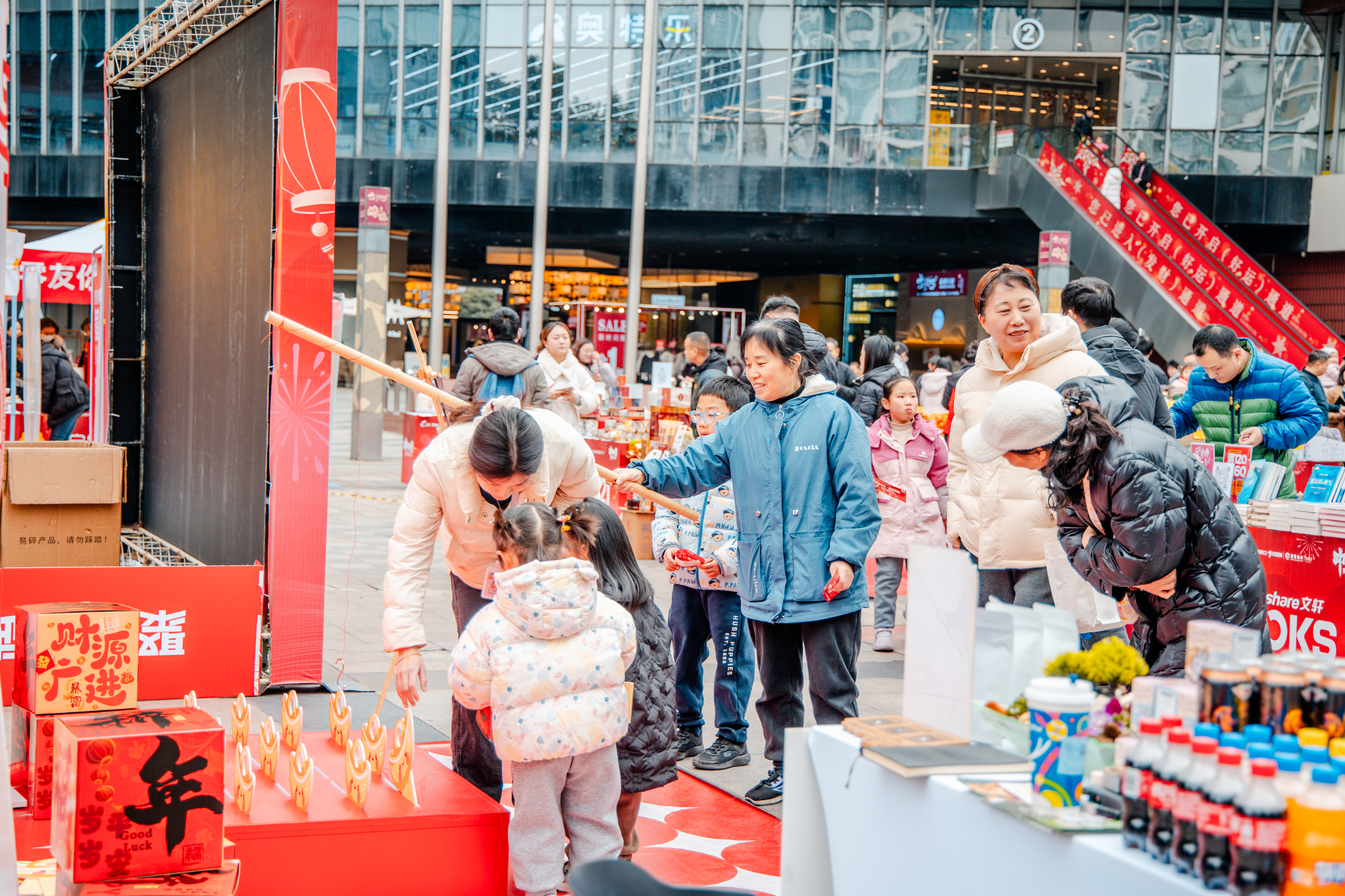 除了“买买买”,现场设置的“集章打卡兑换礼品”互动活动则提升了参与感和趣味性。互动游戏区成为大人和孩子们的乐园,套圈、射箭等简单有趣的活动吸引大家排起长队,现场洋溢着喜迎新春的欢乐气氛。