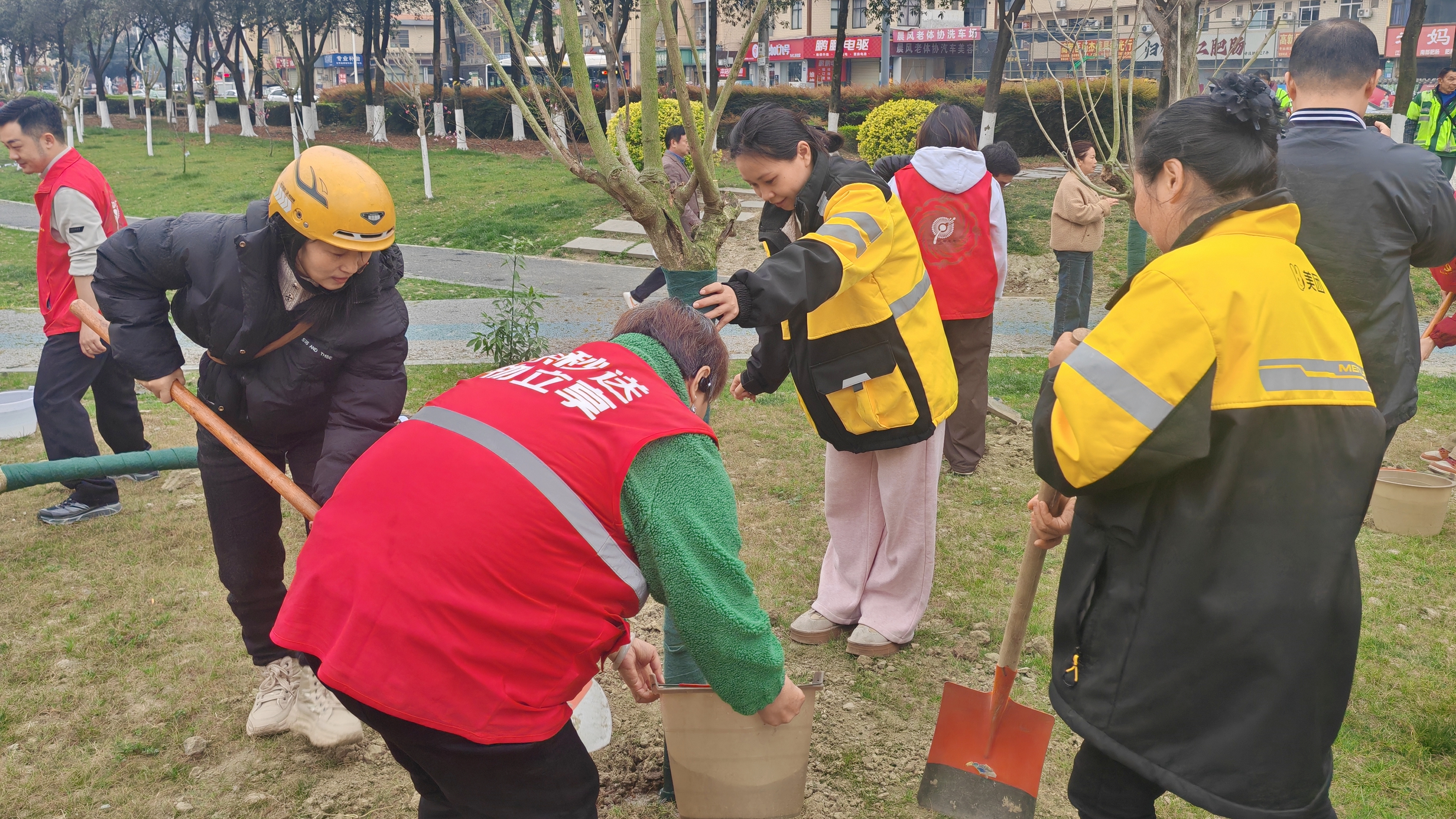 在百草路与天河路交汇处,辖区干部职工、企业代表、西南交通大学志愿者协会党员代表分工协作,种植树苗。活动现场,一道道亮眼的黄色身影格外引人注目。作为城市“流动风景线”,辖区的外卖骑手志愿者们自发组队,搬树苗、挖树坑,效率颇高。劳作间隙,大家闲聊家常、分享工作感悟,既拉近了距离,也切实感受到街道与社区大家庭的凝聚力,归属感愈发强烈。