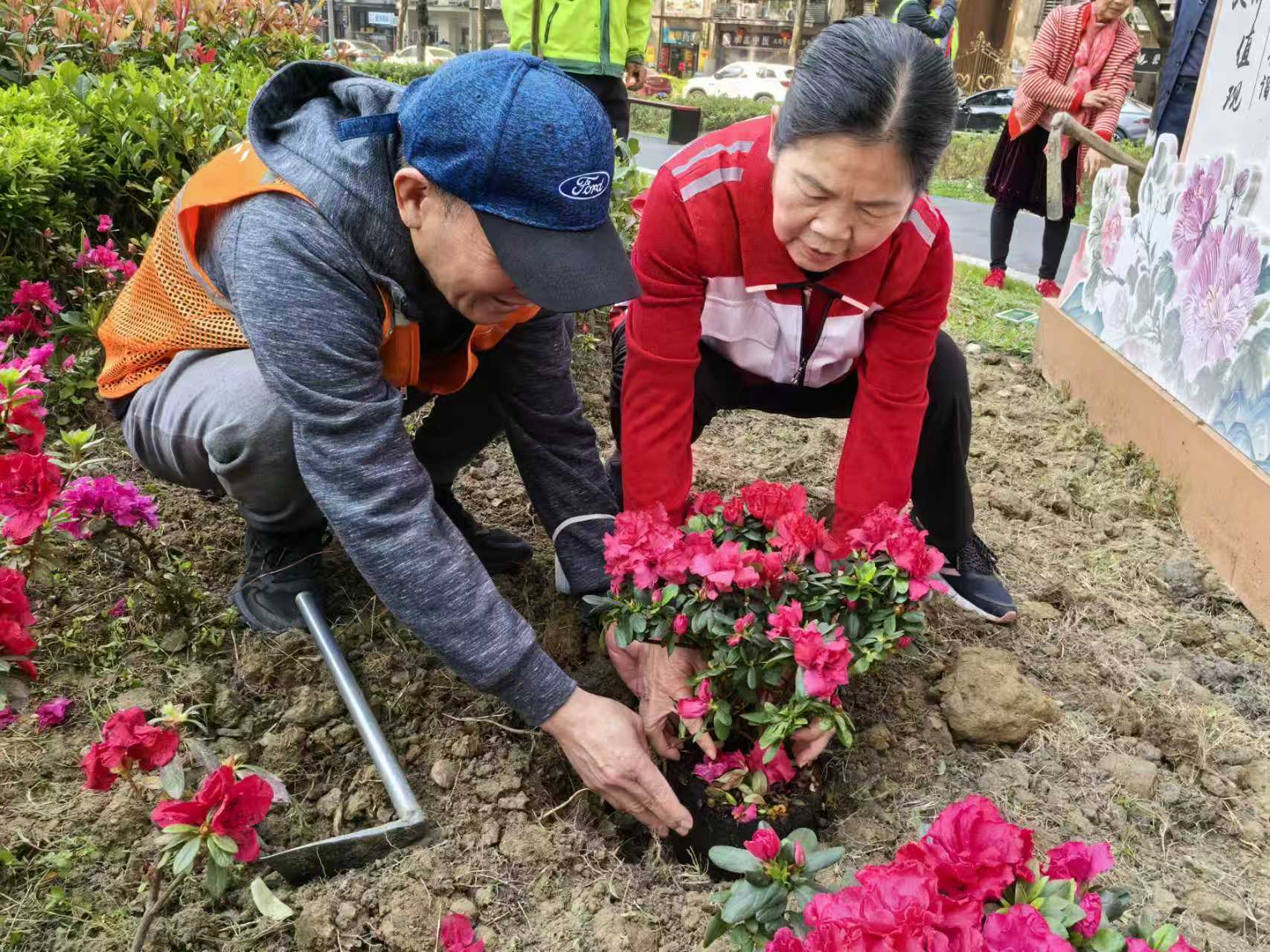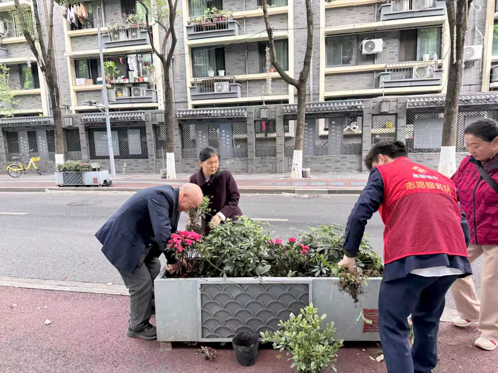社区居民、志愿者们对沿街花箱进行植物补给