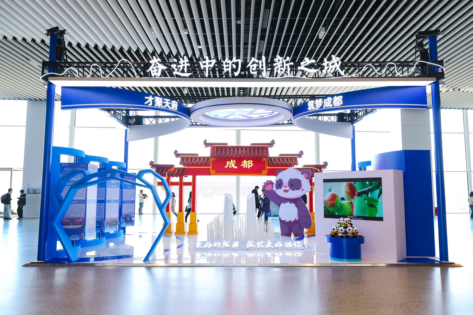 蓉品特色展区背后的展板上,呈现了由成都市美术家协会、书法家协会12位创作人共同完成的画作《公园城市 幸福成都》。这幅画曾在2023年成都大运会主场外交中使用,画中西岭雪山的千秋寒意与双子塔的现代光影遥相呼应,实现了古今在同一轴线上“呼吸”。