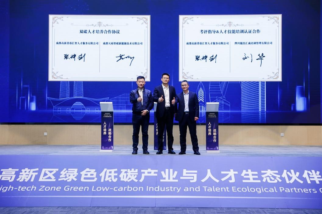 会上,人才公司与成都天府智碳新能源技术有限公司签署《“双碳”人才培养合作协议》,并联合发布“绿色英才计划”。该“计划”旨在解决企业长期以来“懂技术的不懂碳,懂碳的不懂产业”等行业痛点,为更多从业者提供应对国际绿色贸易壁垒的实战能力。