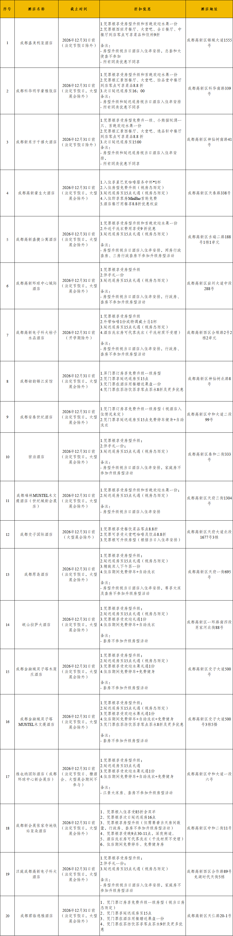 值得一提的是,观众凭演出票根还可享受成都高新区部分酒店专属优惠,让观演与休闲相融合,在艺术浸润中感受城市的温度与活力(具体优惠详见文末表格)。