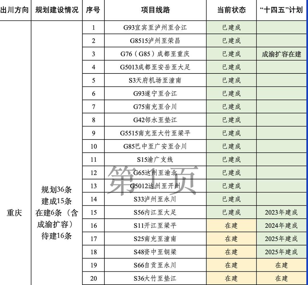 四川省交通运输厅建管处统计,目前川渝之间的高速公路已建成15条,在建6条,规划中的有36条。其中,梁开高速将于年内建成通车,到2024年年底,川渝间高速大通道将达到16条。